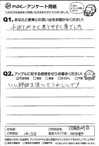 お車のご相談・ 査定だけでもOK! カンタン 入力 30秒 アップルがブランド買取始めました! お電話でも受付中! 受付時間09:30 ~ 18:30 0561-75-6616 お車のご相談・ 査定だけでもOK! カンタン 入力 30秒 アップルがブランド買取始めました! お電話でも受付中! 受付時間09:30 ~ 18:30 0561-75-6616 アップルがブランド買取始めました! お電話でも受付中! 受付時間09:30 ~ 18:30 0561-75-6616 店舗情報 在庫車 スタッフ紹介 ブログ お客様の声 キャンペーン 無料査定 click お客様の声 ご記入日: 2013/01/13 匿名希望様 【愛車との思い出】小回りがきく乗りやすい車でした。【アップルに対する感想】いい評価を頂いてうれしいです。 前へ 次へ お客様の声一覧を見る