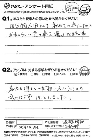 お車のご相談・ 査定だけでもOK! カンタン 入力 30秒 アップルがブランド買取始めました! お電話でも受付中! 受付時間09:30 ~ 18:30 0561-75-6616 お車のご相談・ 査定だけでもOK! カンタン 入力 30秒 アップルがブランド買取始めました! お電話でも受付中! 受付時間09:30 ~ 18:30 0561-75-6616 アップルがブランド買取始めました! お電話でも受付中! 受付時間09:30 ~ 18:30 0561-75-6616 店舗情報 在庫車 スタッフ紹介 ブログ お客様の声 キャンペーン 無料査定 click お客様の声 ご記入日: 2013/01/15 匿名希望様 【愛車との思い出】自分個人用として初めての車だったのでかわいらしい色の車を選んだ時の事【アップルに対する感想】店内も明るく、女性一人で入るのも気にならずほっとしました。 前へ 次へ お客様の声一覧を見る
