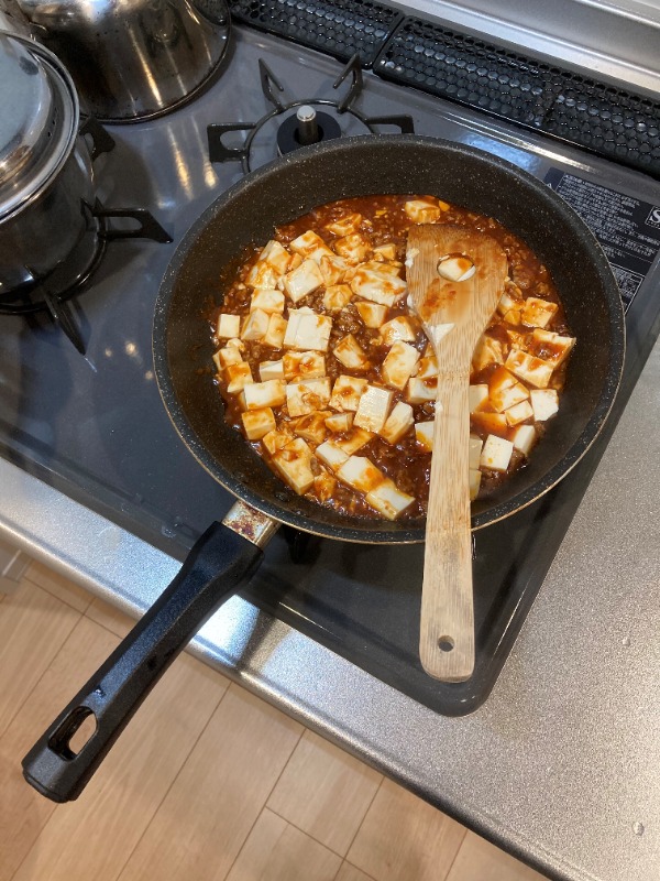 牛ひき肉と豆腐を入れて炒めて完成なんです!