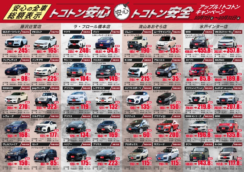 お車のご相談・ 査定だけでもOK! カンタン 入力 30秒 アップルがブランド買取始めました! お電話でも受付中! 受付時間10:00 ~ 18:30 0120-974-899 お車のご相談・ 査定だけでもOK! カンタン 入力 30秒 アップルがブランド買取始めました! お電話でも受付中! 受付時間10:00 ~ 18:30 0120-974-899 アップルがブランド買取始めました! お電話でも受付中! 受付時間10:00 ~ 18:30 0120-974-899 店舗情報 在庫車 スタッフ紹介 ブログ お客様の声 キャンペーン お得 無料査定 click [ 未分類 ] 2023/10/06 (金) 19:46 【4店舗合同】キャンペーン特別プラン(10月7日~10月31日) 皆さまこんにちは!!ブログでは初登場!スタッフの高橋です!!9月も沢山のご来店、誠にありがとうございました(^^♪ありがたい事に、とても忙しくさせて頂き10月も引き続きよろしくお願いします!!アップルのトコトンキャンペーンが10月7日(土)~10月31日(日)限定で始まります🍎お車をご購入いただいたお客様に全部プレゼント!!詳しくは添付したチラシをご覧ください♪♪♪藤沢辻堂店の目玉車は、なななんと、ヴィッツ RS!!是非この機会にお問い合わせ、ご来店、心よりお待ちしております!! 2023-10-06 19:46:00 新しい記事へ 古い記事へ 最新記事 メガーヌスポーツツアラーGTのドライビングモードとは?買取厳選車両 入庫情報!「86GT!!!」メガーヌスポーツツアラーGTの足元はやっぱりカッコいい【GW前に車決めませんか?】営業スタッフ高木は増車します!!【GWの予定は車が決まってから!!】 店舗情報に戻る 月別アーカイブ 2026年04月(5)2026年03月(11)2026年02月(5)2026年01月(2)2025年12月(9)2025年11月(4)2025年10月(4)2025年09月(12)2025年08月(8)2025年07月(6)2025年06月(3)2025年04月(2)2025年03月(2)2025年02月(2)2024年12月(3)2024年11月(2)2024年10月(6)2024年09月(1)2024年05月(1)2024年04月(1)2024年02月(1)2024年01月(1)2023年12月(1)2023年11月(1)2023年10月(2)2023年09月(1)2023年08月(1)2023年07月(3)2023年06月(2)2023年05月(1)2023年04月(1)2023年02月(1)2023年01月(3)2022年12月(3)2022年11月(2)2022年10月(1)2022年09月(4)2022年08月(1)2022年07月(1)2022年06月(1)2022年04月(1)2022年03月(2)2022年02月(1)2022年01月(2)2021年12月(2)2021年11月(2)2021年10月(2)2021年09月(1)2021年08月(2)2021年07月(4)2021年06月(4)2021年05月(5)2021年04月(4)2021年03月(1)2021年02月(4)2021年01月(6)2020年12月(1)2020年11月(3)2020年10月(1)2020年09月(1)2020年08月(1)2020年07月(1)2020年06月(2)2020年05月(1)2020年04月(1)2020年03月(1)2020年02月(1)2020年01月(1)2019年12月(2)2019年11月(1)2019年09月(2)2019年08月(3)2019年07月(4)2019年06月(3)2019年05月(1)2019年04月(1)2019年03月(1)2019年02月(2)2019年01月(4)2018年12月(4)2018年11月(2)2018年10月(5)2018年09月(2)2018年08月(3)2018年07月(4)2018年06月(4)2018年05月(3)2018年04月(5)2018年03月(1)2018年02月(3)2018年01月(3)2017年12月(4)2017年11月(4)2017年10月(1)2017年09月(2)2017年08月(1)2017年07月(1)2017年06月(2)2017年05月(1)2017年01月(4)2016年12月(1)2016年11月(1)2016年10月(1)2016年09月(2)2016年08月(1)2016年07月(2)2016年06月(1)2016年05月(2)2016年04月(1)2016年03月(1)2016年02月(1)2016年01月(1)2015年12月(1)2015年11月(1)2015年09月(2)2015年08月(1)2015年07月(2)2015年04月(1)2015年03月(1)2015年02月(1)2015年01月(2)2014年12月(2)2014年10月(3)