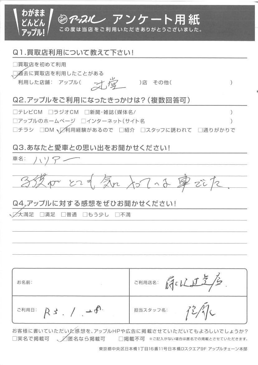お車のご相談・ 査定だけでもOK! カンタン 入力 30秒 アップルがブランド買取始めました! お電話でも受付中! 受付時間10:00 ~ 18:30 0120-974-899 お車のご相談・ 査定だけでもOK! カンタン 入力 30秒 アップルがブランド買取始めました! お電話でも受付中! 受付時間10:00 ~ 18:30 0120-974-899 アップルがブランド買取始めました! お電話でも受付中! 受付時間10:00 ~ 18:30 0120-974-899 店舗情報 在庫車 スタッフ紹介 ブログ お客様の声 キャンペーン お得 無料査定 click お客様の声 ご記入日: 2021/01/28 匿名希望様 車名:トヨタ ハリアー (H25年12月~のハイブリッド含む) Q.あなたと愛車との思い出をお聞かせください!A.子供がとても気に入っていた車でした担当:後藤 前へ 次へ お客様の声一覧を見る