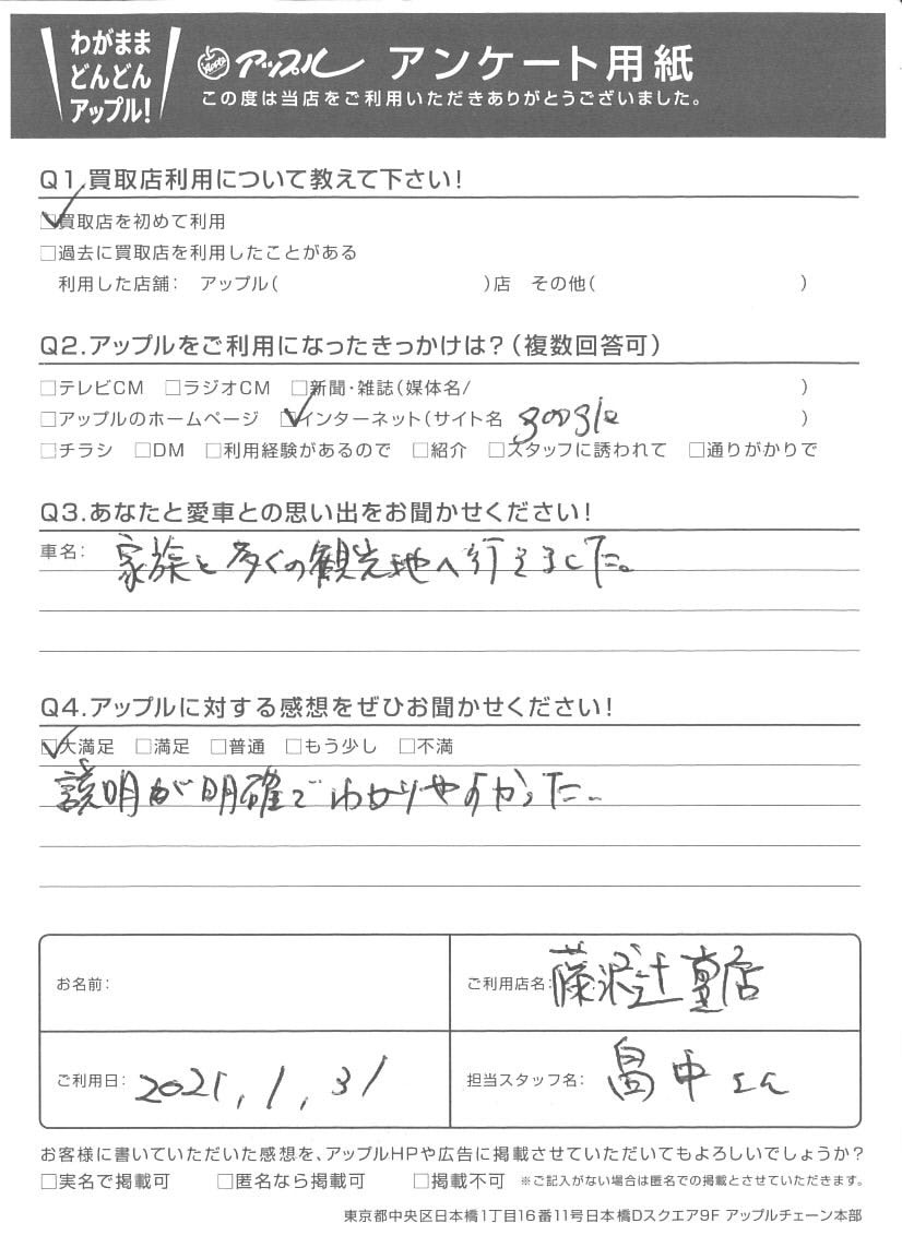 お車のご相談・ 査定だけでもOK! カンタン 入力 30秒 アップルがブランド買取始めました! お電話でも受付中! 受付時間10:00 ~ 18:30 0120-974-899 お車のご相談・ 査定だけでもOK! カンタン 入力 30秒 アップルがブランド買取始めました! お電話でも受付中! 受付時間10:00 ~ 18:30 0120-974-899 アップルがブランド買取始めました! お電話でも受付中! 受付時間10:00 ~ 18:30 0120-974-899 店舗情報 在庫車 スタッフ紹介 ブログ お客様の声 キャンペーン お得 無料査定 click お客様の声 ご記入日: 2021/01/31 I様 Q.あなたと愛車との思い出をお聞かせください!A.家族と多くの観光地へ行きました。Q.アップルに対する感想をぜひお聞かせください!A.説明が明確でわかりやすかった。担当:畠中 前へ 次へ お客様の声一覧を見る
