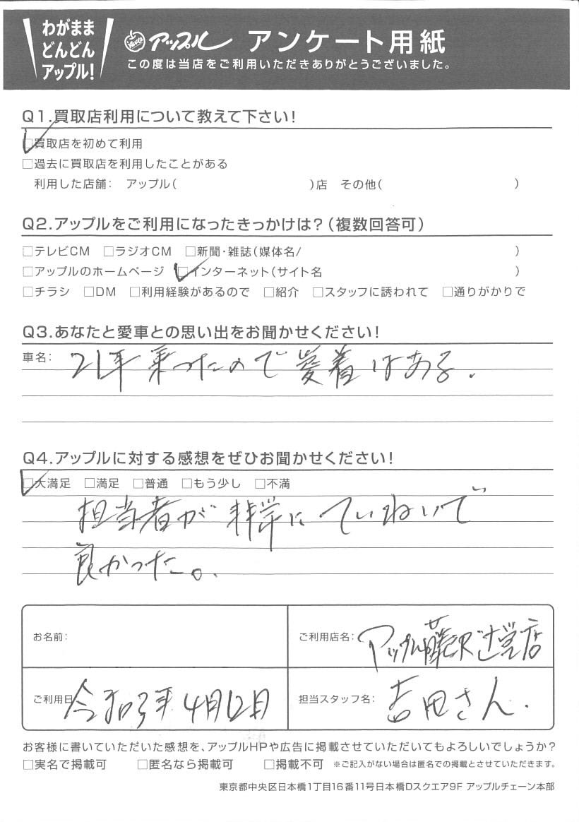 お車のご相談・ 査定だけでもOK! カンタン 入力 30秒 アップルがブランド買取始めました! お電話でも受付中! 受付時間10:00 ~ 18:30 0120-974-899 お車のご相談・ 査定だけでもOK! カンタン 入力 30秒 アップルがブランド買取始めました! お電話でも受付中! 受付時間10:00 ~ 18:30 0120-974-899 アップルがブランド買取始めました! お電話でも受付中! 受付時間10:00 ~ 18:30 0120-974-899 店舗情報 在庫車 スタッフ紹介 ブログ お客様の声 キャンペーン お得 無料査定 click お客様の声 ご記入日: 2021/04/12 T様 Q.あなたと愛車との思い出をお聞かせください!A.21年乗ったので愛着はある。Q.アップルに対する感想をぜひお聞かせください!A.担当者が非常にていねいで良かった。担当:吉田 前へ 次へ お客様の声一覧を見る