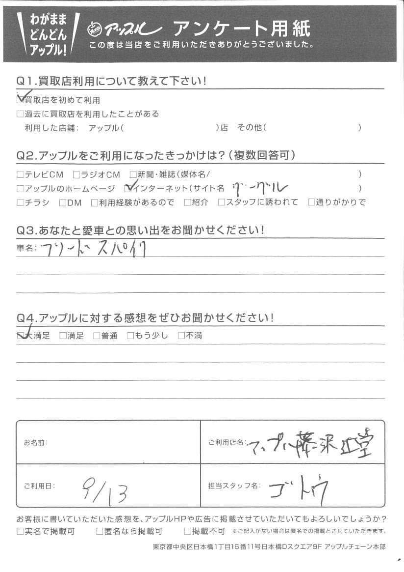 お車のご相談・ 査定だけでもOK! カンタン 入力 30秒 アップルがブランド買取始めました! お電話でも受付中! 受付時間10:00 ~ 18:30 0120-974-899 お車のご相談・ 査定だけでもOK! カンタン 入力 30秒 アップルがブランド買取始めました! お電話でも受付中! 受付時間10:00 ~ 18:30 0120-974-899 アップルがブランド買取始めました! お電話でも受付中! 受付時間10:00 ~ 18:30 0120-974-899 店舗情報 在庫車 スタッフ紹介 ブログ お客様の声 キャンペーン お得 無料査定 click お客様の声 ご記入日: 2021/09/13 N様 Q.アップルに対する感想をぜひお聞かせください!A.大満足担当:後藤 前へ 次へ お客様の声一覧を見る