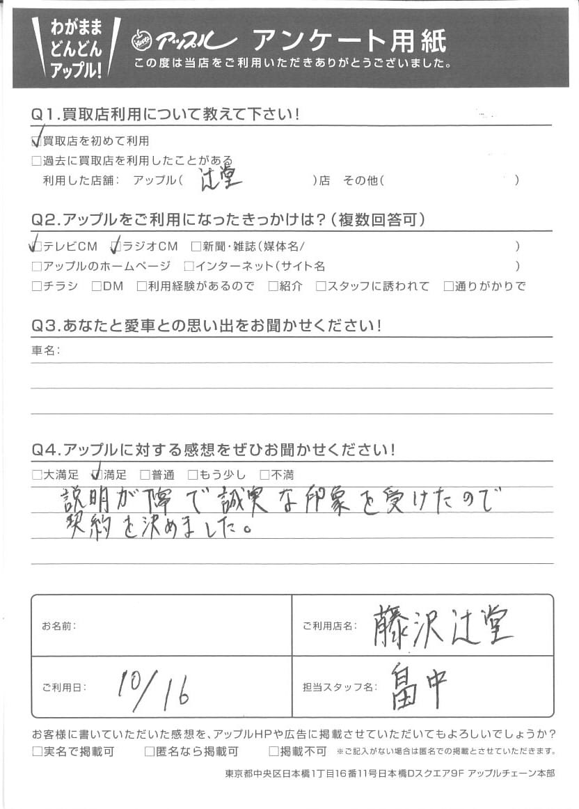お車のご相談・ 査定だけでもOK! カンタン 入力 30秒 アップルがブランド買取始めました! お電話でも受付中! 受付時間10:00 ~ 18:30 0120-974-899 お車のご相談・ 査定だけでもOK! カンタン 入力 30秒 アップルがブランド買取始めました! お電話でも受付中! 受付時間10:00 ~ 18:30 0120-974-899 アップルがブランド買取始めました! お電話でも受付中! 受付時間10:00 ~ 18:30 0120-974-899 店舗情報 在庫車 スタッフ紹介 ブログ お客様の声 キャンペーン お得 無料査定 click お客様の声 ご記入日: 2021/10/16 T様 Q.アップルに対する感想をぜひお聞かせください!A.説明が丁寧で誠実な印象を受けたので契約を決めました。担当:畠中 前へ 次へ お客様の声一覧を見る