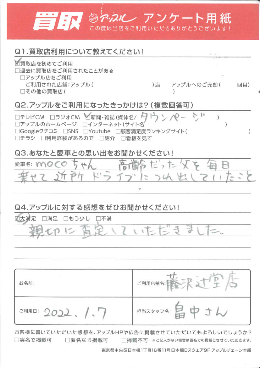 お車のご相談・ 査定だけでもOK! カンタン 入力 30秒 アップルがブランド買取始めました! お電話でも受付中! 受付時間10:00 ~ 18:30 0120-974-899 お車のご相談・ 査定だけでもOK! カンタン 入力 30秒 アップルがブランド買取始めました! お電話でも受付中! 受付時間10:00 ~ 18:30 0120-974-899 アップルがブランド買取始めました! お電話でも受付中! 受付時間10:00 ~ 18:30 0120-974-899 店舗情報 在庫車 スタッフ紹介 ブログ お客様の声 キャンペーン お得 無料査定 click お客様の声 ご記入日: 2022/01/07 T様 車名:日産 モコ Q.あなたと愛車との思い出をお聞かせください!A.高齢だった父を毎日乗せて近所ドライブにつれ出していたことQ.アップルに対する感想をぜひお聞かせください!A.親切に査定していただきました担当:畠中 前へ 次へ お客様の声一覧を見る