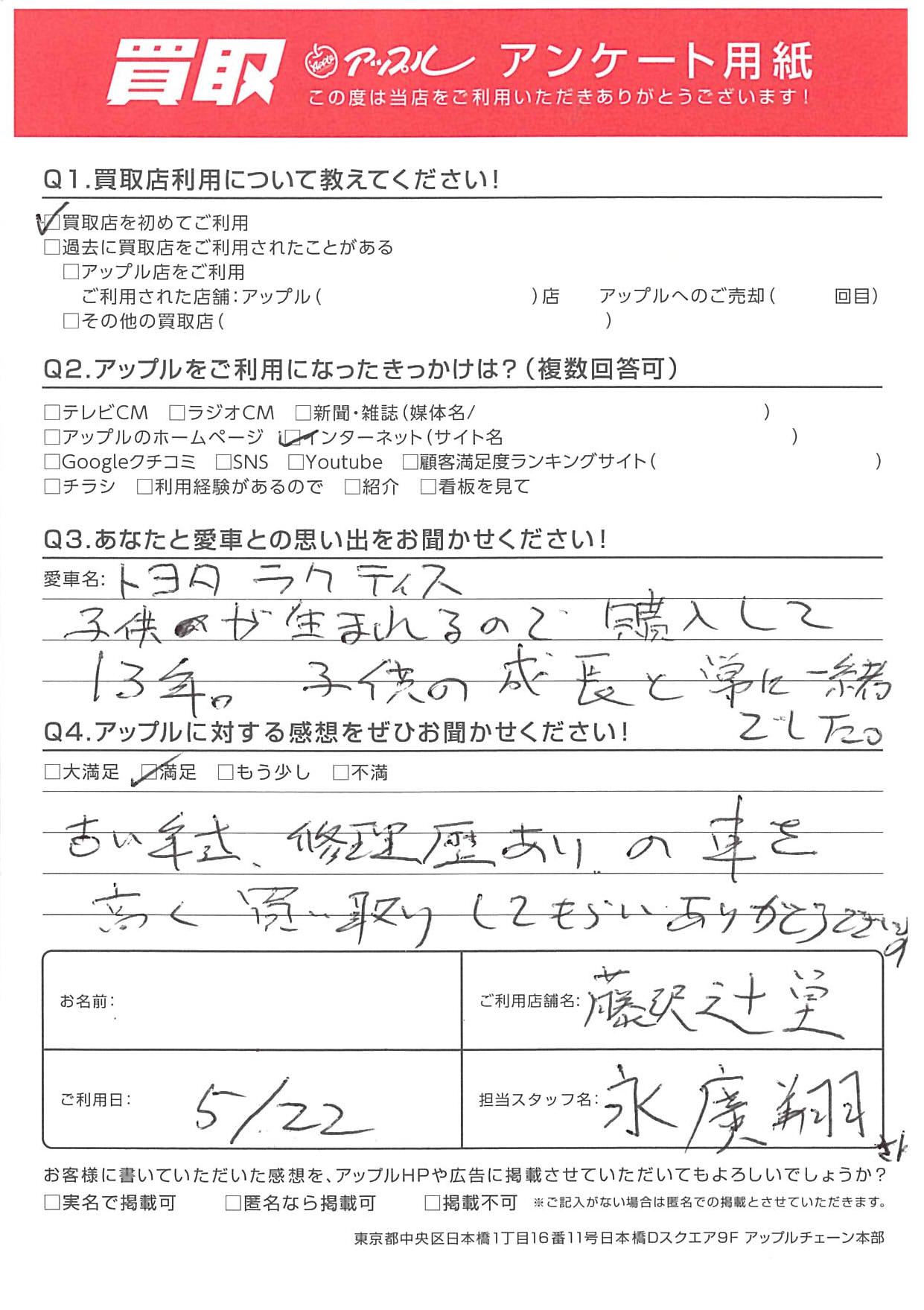 お車のご相談・ 査定だけでもOK! カンタン 入力 30秒 アップルがブランド買取始めました! お電話でも受付中! 受付時間10:00 ~ 18:30 0120-974-899 お車のご相談・ 査定だけでもOK! カンタン 入力 30秒 アップルがブランド買取始めました! お電話でも受付中! 受付時間10:00 ~ 18:30 0120-974-899 アップルがブランド買取始めました! お電話でも受付中! 受付時間10:00 ~ 18:30 0120-974-899 店舗情報 在庫車 スタッフ紹介 ブログ お客様の声 キャンペーン お得 無料査定 click お客様の声 ご記入日: 2022/05/22 K様 車名:トヨタ ラクティス Q.あなたと愛車との思い出をお聞かせください!A.子供が生まれるので、購入して13年。子供の成長と常に一緒でした。Q.アップルに対する感想をぜひお聞かせください!A.古い年式、修理歴ありの車を高く買い取りしてもらいありがとうございます。担当:永廣 前へ 次へ お客様の声一覧を見る