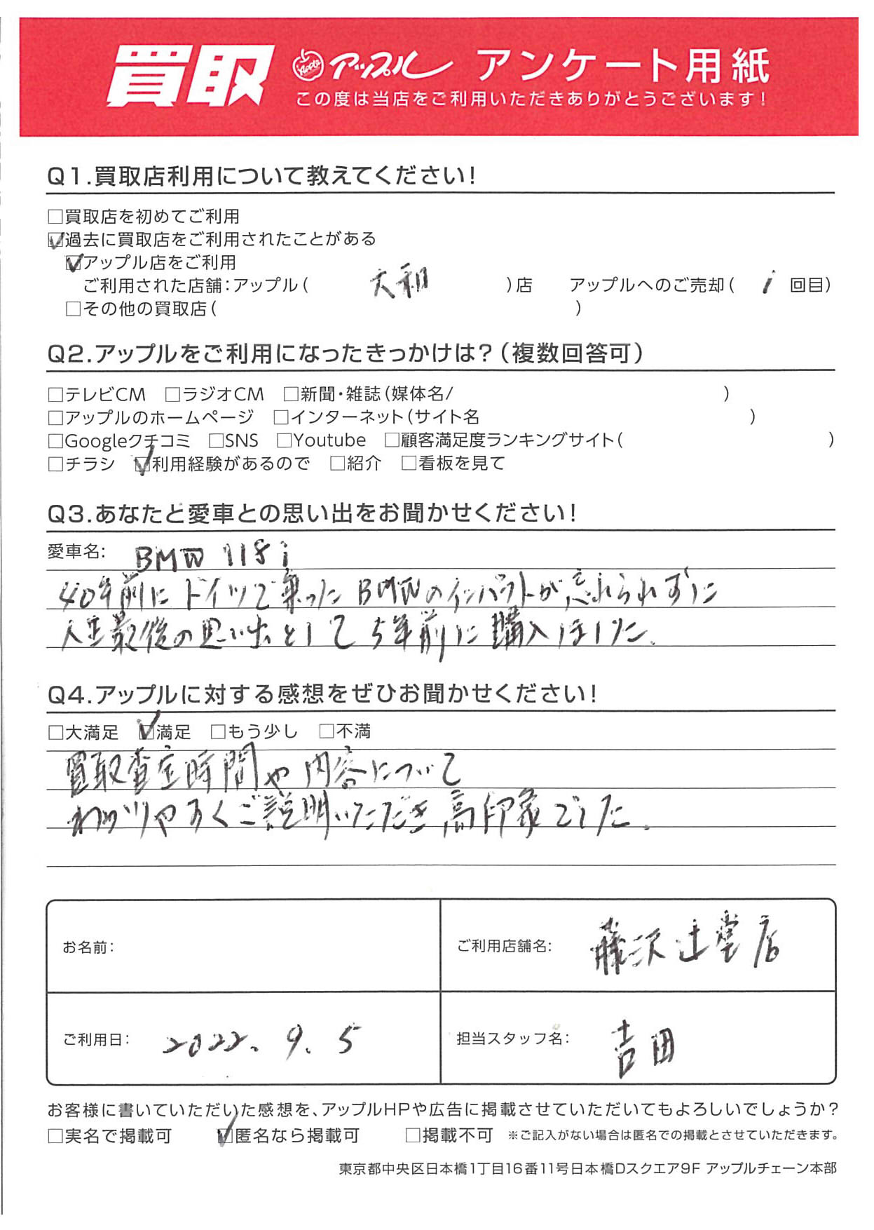 お車のご相談・ 査定だけでもOK! カンタン 入力 30秒 アップルがブランド買取始めました! お電話でも受付中! 受付時間10:00 ~ 18:30 0120-974-899 お車のご相談・ 査定だけでもOK! カンタン 入力 30秒 アップルがブランド買取始めました! お電話でも受付中! 受付時間10:00 ~ 18:30 0120-974-899 アップルがブランド買取始めました! お電話でも受付中! 受付時間10:00 ~ 18:30 0120-974-899 店舗情報 在庫車 スタッフ紹介 ブログ お客様の声 キャンペーン お得 無料査定 click お客様の声 ご記入日: 2022/09/05 匿名希望様 車名:BMW 1シリーズ Q.あなたと愛車との思い出をお聞かせください!A.40年前にドイツで乗ったBMWのインパクトが忘れられずに 人生最後の思い出として5年前に購入しました。Q.アップルに対する感想をぜひお聞かせください!A.買取査定時間や内容いついてわかりやすくご説明いただき 好印象でした。担当:吉田 前へ 次へ お客様の声一覧を見る
