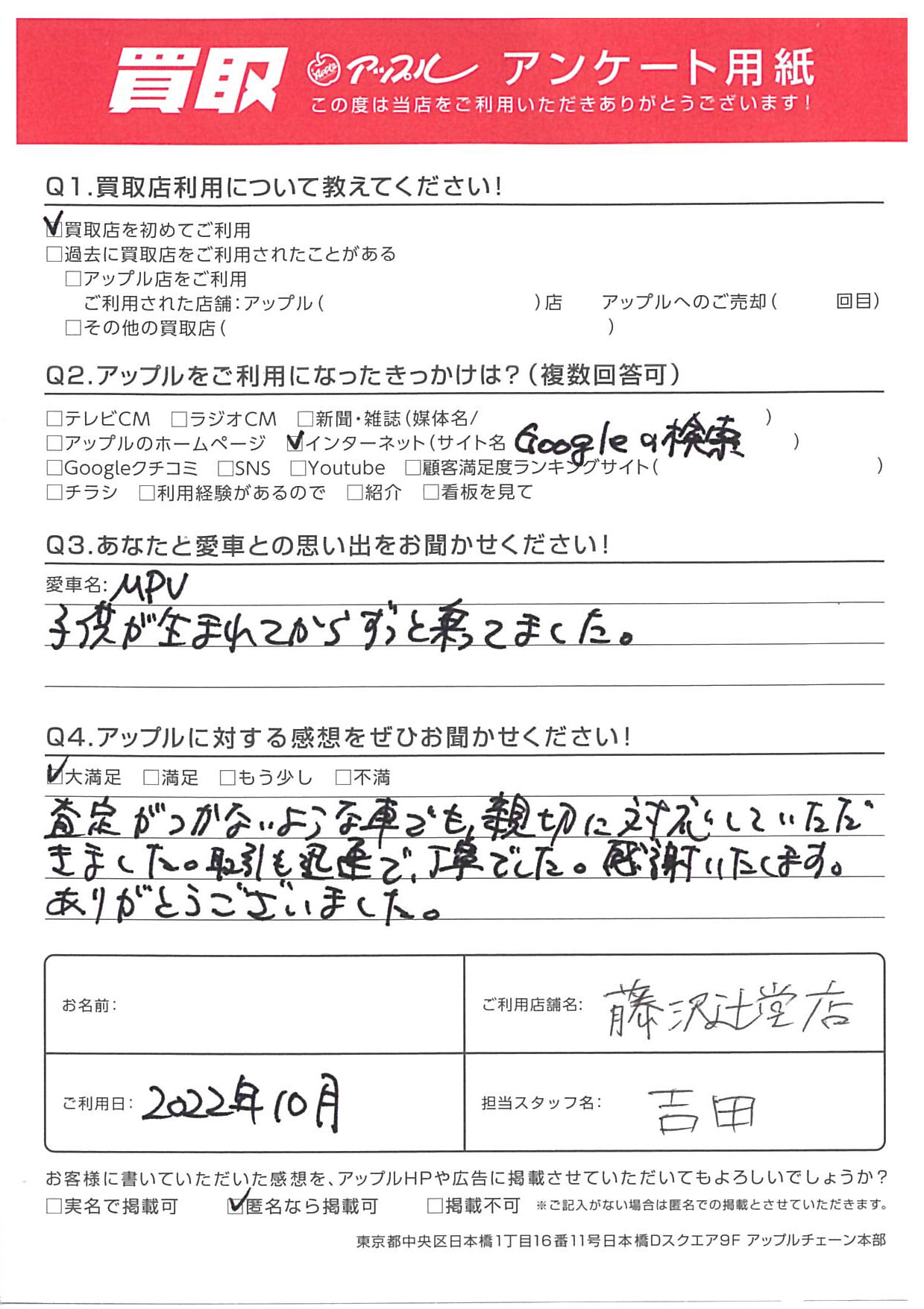 お車のご相談・ 査定だけでもOK! カンタン 入力 30秒 アップルがブランド買取始めました! お電話でも受付中! 受付時間10:00 ~ 18:30 0120-974-899 お車のご相談・ 査定だけでもOK! カンタン 入力 30秒 アップルがブランド買取始めました! お電話でも受付中! 受付時間10:00 ~ 18:30 0120-974-899 アップルがブランド買取始めました! お電話でも受付中! 受付時間10:00 ~ 18:30 0120-974-899 店舗情報 在庫車 スタッフ紹介 ブログ お客様の声 キャンペーン お得 無料査定 click お客様の声 ご記入日: 2022/10/01 匿名希望様 車名:マツダ MPV Q.あなたと愛車との思い出をお聞かせください!A.子供が生まれてからずっと乗ってました。Q.アップルに対する感想をぜひお聞かせください!A.査定がつかないような車でも、親切に対応していただきました。 取引も迅速で、丁寧でした。感謝いたします。ありがとうございました。担当:吉田 前へ 次へ お客様の声一覧を見る