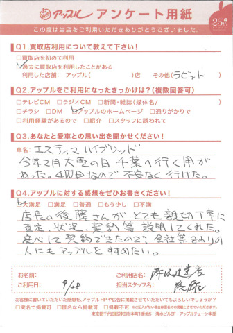 お車のご相談・ 査定だけでもOK! カンタン 入力 30秒 アップルがブランド買取始めました! お電話でも受付中! 受付時間10:00 ~ 18:30 0120-974-899 お車のご相談・ 査定だけでもOK! カンタン 入力 30秒 アップルがブランド買取始めました! お電話でも受付中! 受付時間10:00 ~ 18:30 0120-974-899 アップルがブランド買取始めました! お電話でも受付中! 受付時間10:00 ~ 18:30 0120-974-899 店舗情報 在庫車 スタッフ紹介 ブログ お客様の声 キャンペーン お得 無料査定 click お客様の声 ご記入日: 2014/11/18 Y様 お車:エスティマハイブリッドQ.愛車との思い出は? A.今年2月大雪の日 千葉へ行く用があった。4WDなので不安なく行けた。Q.アップルの感想は? A.店長の後藤さんがとても親切丁寧に査定、状況、契約等説明してくれた。安心して計約できたので、会社等まわりの人にもアップルをすすめたい。 前へ 次へ お客様の声一覧を見る