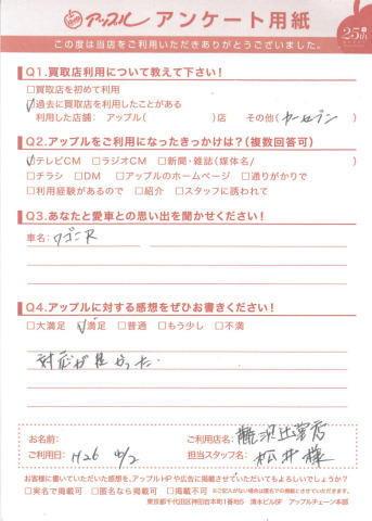 お車のご相談・ 査定だけでもOK! カンタン 入力 30秒 アップルがブランド買取始めました! お電話でも受付中! 受付時間10:00 ~ 18:30 0120-974-899 お車のご相談・ 査定だけでもOK! カンタン 入力 30秒 アップルがブランド買取始めました! お電話でも受付中! 受付時間10:00 ~ 18:30 0120-974-899 アップルがブランド買取始めました! お電話でも受付中! 受付時間10:00 ~ 18:30 0120-974-899 店舗情報 在庫車 スタッフ紹介 ブログ お客様の声 キャンペーン お得 無料査定 click お客様の声 ご記入日: 2014/12/05 S様 お車:ワゴンRQ.アップルの感想は? A.対応が良かった 前へ 次へ お客様の声一覧を見る