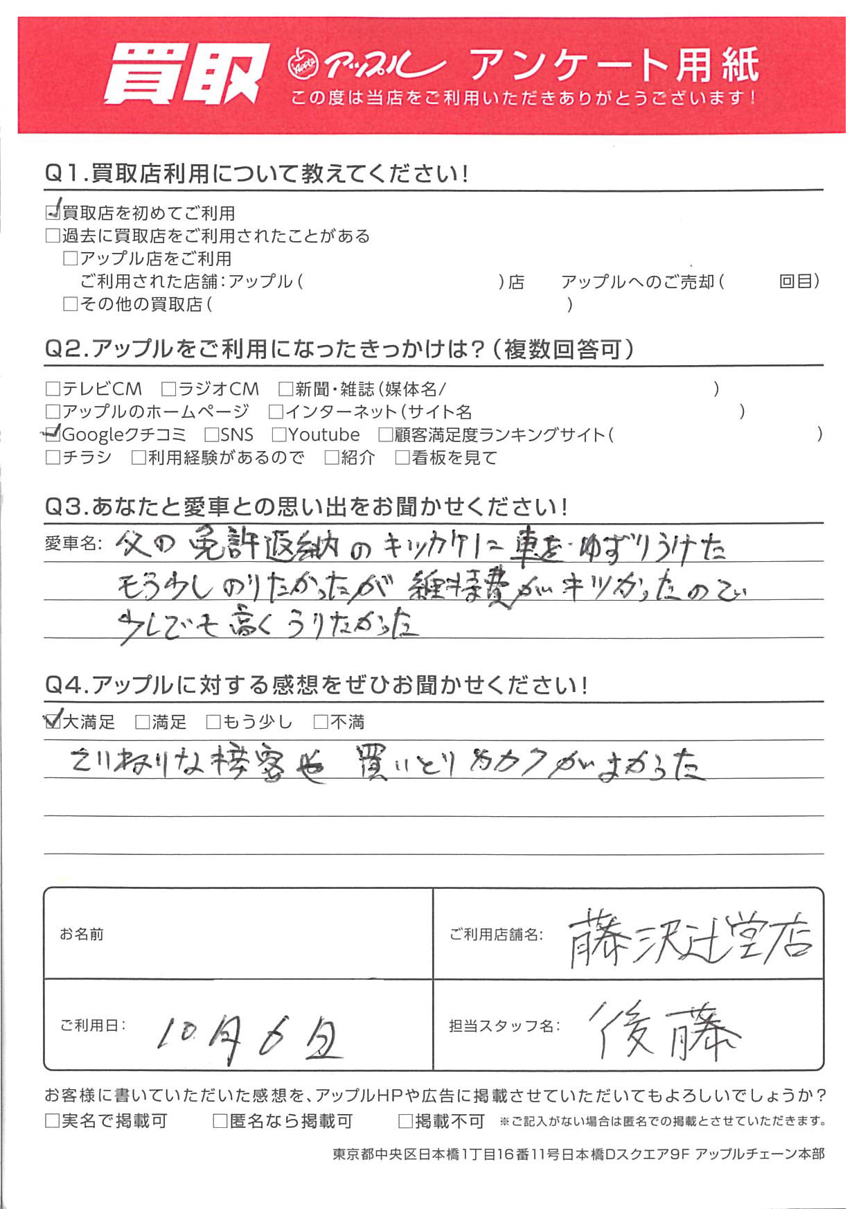 お車のご相談・ 査定だけでもOK! カンタン 入力 30秒 アップルがブランド買取始めました! お電話でも受付中! 受付時間10:00 ~ 18:30 0120-974-899 お車のご相談・ 査定だけでもOK! カンタン 入力 30秒 アップルがブランド買取始めました! お電話でも受付中! 受付時間10:00 ~ 18:30 0120-974-899 アップルがブランド買取始めました! お電話でも受付中! 受付時間10:00 ~ 18:30 0120-974-899 店舗情報 在庫車 スタッフ紹介 ブログ お客様の声 キャンペーン お得 無料査定 click お客様の声 ご記入日: 2022/10/06 S様 Q.あなたと愛車との思い出をお聞かせください!A.父の免許返納のキッカケに車をゆずりうけた もう少しのりたかったが維持費がキツかったので 少しでも高くうりたかったQ.アップルに対する感想をぜひお聞かせください!A.ていねいな接客や買いとりカカクがよかった担当:後藤 前へ 次へ お客様の声一覧を見る
