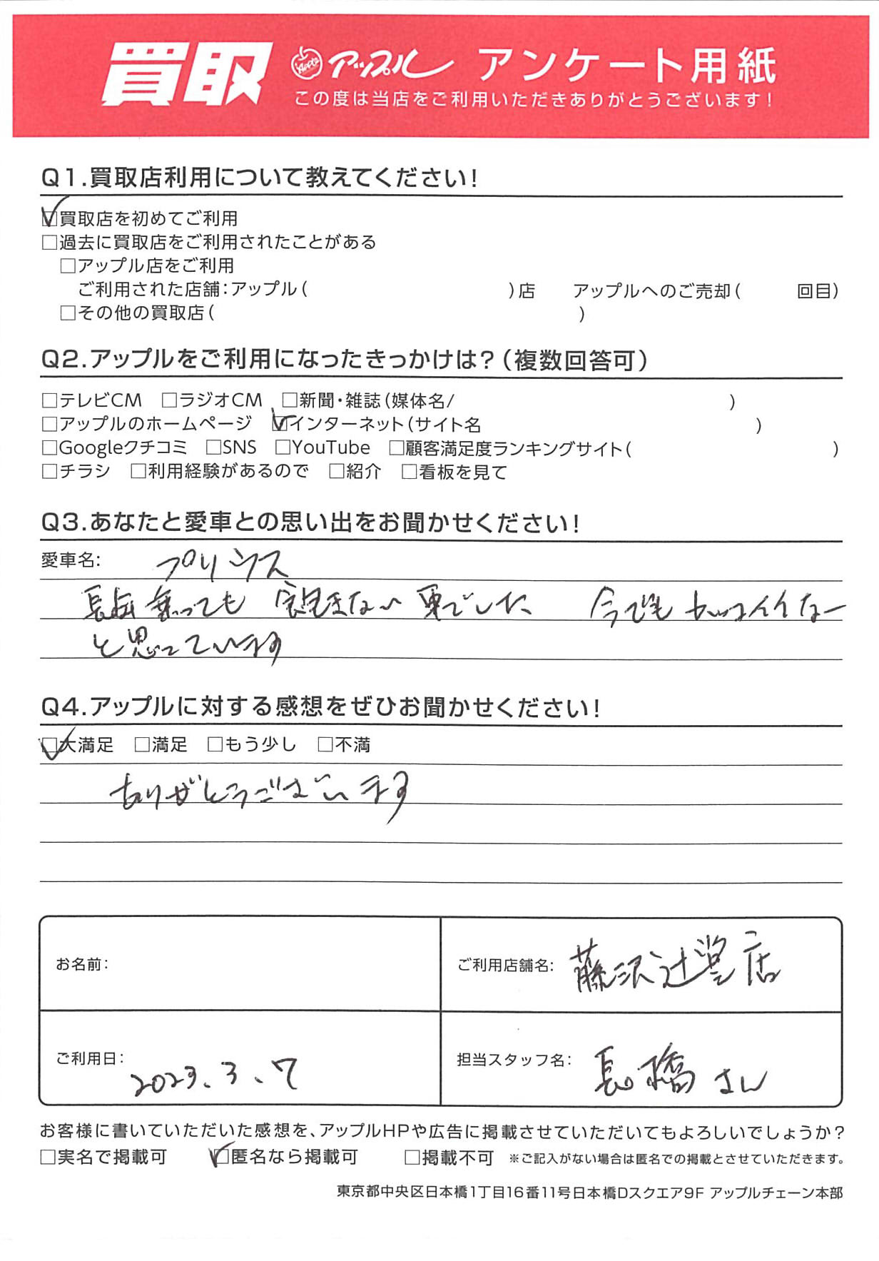 お車のご相談・ 査定だけでもOK! カンタン 入力 30秒 アップルがブランド買取始めました! お電話でも受付中! 受付時間10:00 ~ 18:30 0120-974-899 お車のご相談・ 査定だけでもOK! カンタン 入力 30秒 アップルがブランド買取始めました! お電話でも受付中! 受付時間10:00 ~ 18:30 0120-974-899 アップルがブランド買取始めました! お電話でも受付中! 受付時間10:00 ~ 18:30 0120-974-899 店舗情報 在庫車 スタッフ紹介 ブログ お客様の声 キャンペーン お得 無料査定 click お客様の声 ご記入日: 2023/03/07 匿名希望様 車名:トヨタ プリウス(2023年3月~のPHVを含む) Q.あなたと愛車との思い出をお聞かせください!A.長年乗っても飽きない車でした 今でもカッコイイなーと思っていますQ.アップルに対する感想をぜひお聞かせください!A.ありがとうございます担当:長橋 前へ 次へ お客様の声一覧を見る