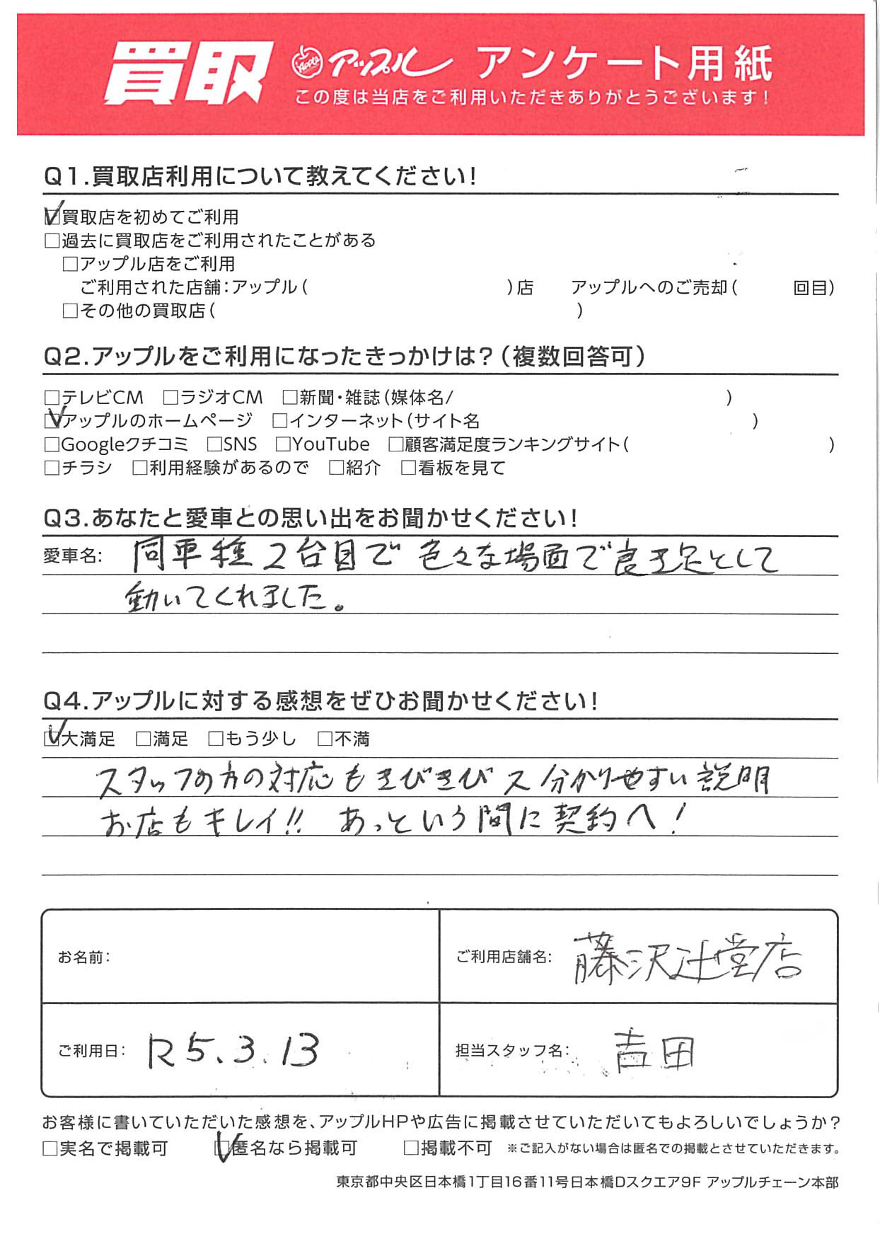 お車のご相談・ 査定だけでもOK! カンタン 入力 30秒 アップルがブランド買取始めました! お電話でも受付中! 受付時間10:00 ~ 18:30 0120-974-899 お車のご相談・ 査定だけでもOK! カンタン 入力 30秒 アップルがブランド買取始めました! お電話でも受付中! 受付時間10:00 ~ 18:30 0120-974-899 アップルがブランド買取始めました! お電話でも受付中! 受付時間10:00 ~ 18:30 0120-974-899 店舗情報 在庫車 スタッフ紹介 ブログ お客様の声 キャンペーン お得 無料査定 click お客様の声 ご記入日: 2023/03/13 匿名希望様 Q.あなたと愛車との思い出をお聞かせください!A.同車種2台目で色々な場面で良き足として動いてくれました。Q.アップルに対する感想をぜひお聞かせください!A.スタッフの方の対応もきびきび又、分かりやすい説明 お店もキレイ!!あっという間に契約へ!担当:吉田 前へ 次へ お客様の声一覧を見る
