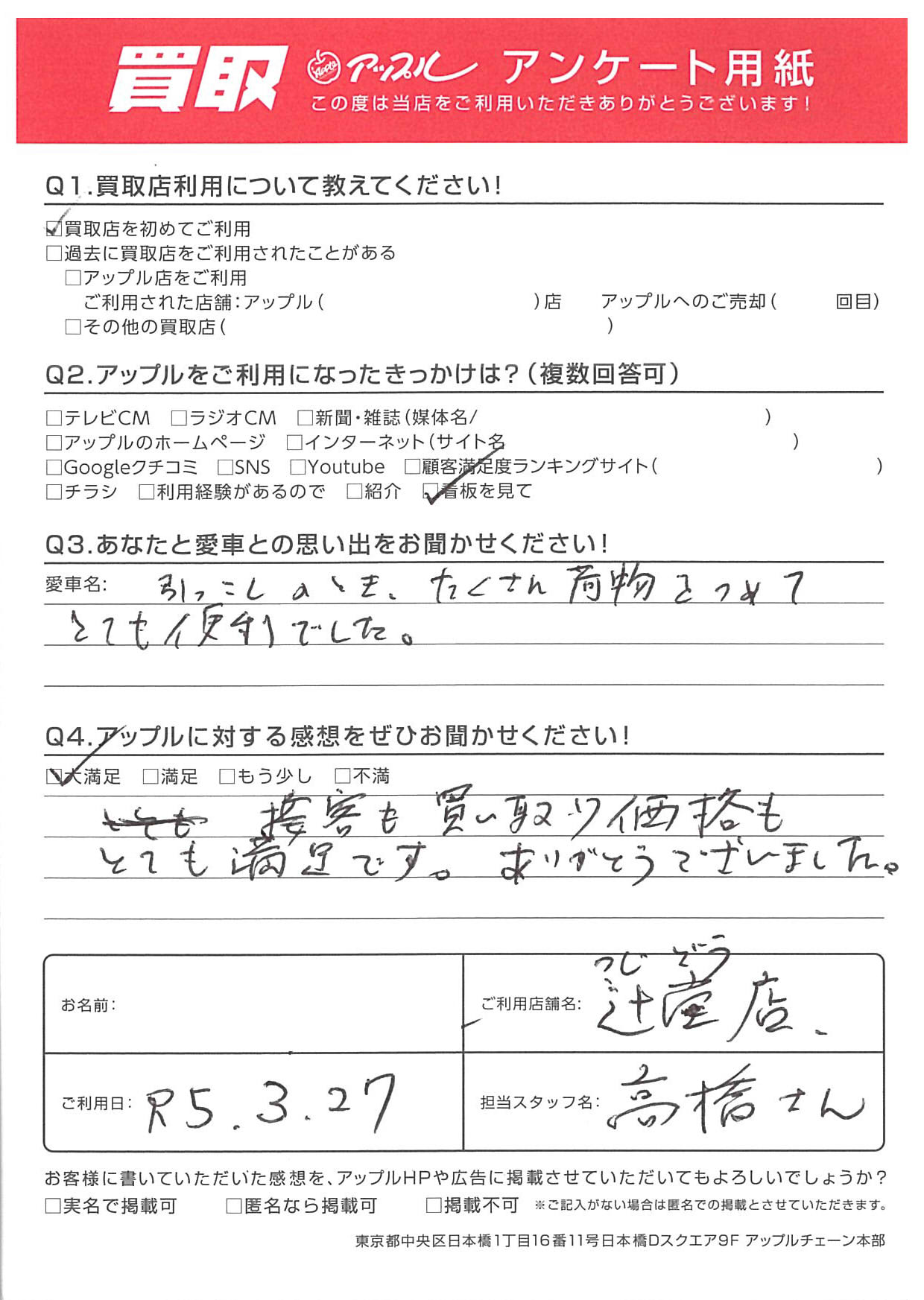 お車のご相談・ 査定だけでもOK! カンタン 入力 30秒 アップルがブランド買取始めました! お電話でも受付中! 受付時間10:00 ~ 18:30 0120-974-899 お車のご相談・ 査定だけでもOK! カンタン 入力 30秒 アップルがブランド買取始めました! お電話でも受付中! 受付時間10:00 ~ 18:30 0120-974-899 アップルがブランド買取始めました! お電話でも受付中! 受付時間10:00 ~ 18:30 0120-974-899 店舗情報 在庫車 スタッフ紹介 ブログ お客様の声 キャンペーン お得 無料査定 click お客様の声 ご記入日: 2023/03/27 Y様 Q.あなたと愛車との思い出をお聞かせください!A.引っ越しのとき、たくさん荷物をつめてとても便利でした。Q.アップルに対する感想をぜひお聞かせください!A.接客も買い取り価格もとても満足です。ありがとうございました。担当:高橋 前へ 次へ お客様の声一覧を見る