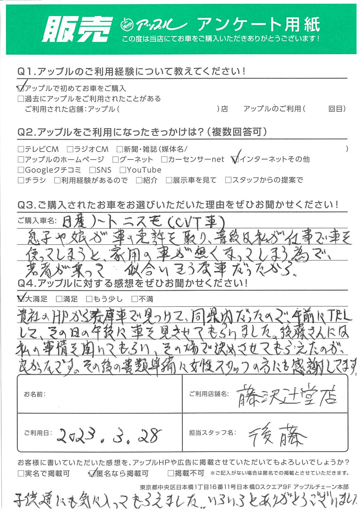 A.貴社のHPから在庫車で見つけて、同県内だったので午前にTELして、