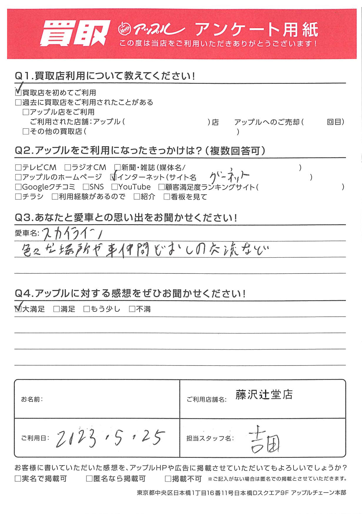 お車のご相談・ 査定だけでもOK! カンタン 入力 30秒 アップルがブランド買取始めました! お電話でも受付中! 受付時間10:00 ~ 18:30 0120-974-899 お車のご相談・ 査定だけでもOK! カンタン 入力 30秒 アップルがブランド買取始めました! お電話でも受付中! 受付時間10:00 ~ 18:30 0120-974-899 アップルがブランド買取始めました! お電話でも受付中! 受付時間10:00 ~ 18:30 0120-974-899 店舗情報 在庫車 スタッフ紹介 ブログ お客様の声 キャンペーン お得 無料査定 click お客様の声 ご記入日: 2023/05/25 S様 車名:日産 スカイライン(セダン) Q.あなたと愛車との思い出をお聞かせください!A.色々な場所や車仲間同士の交流などQ.アップルに対する感想をぜひお聞かせください!A.大満足担当:吉田 前へ 次へ お客様の声一覧を見る