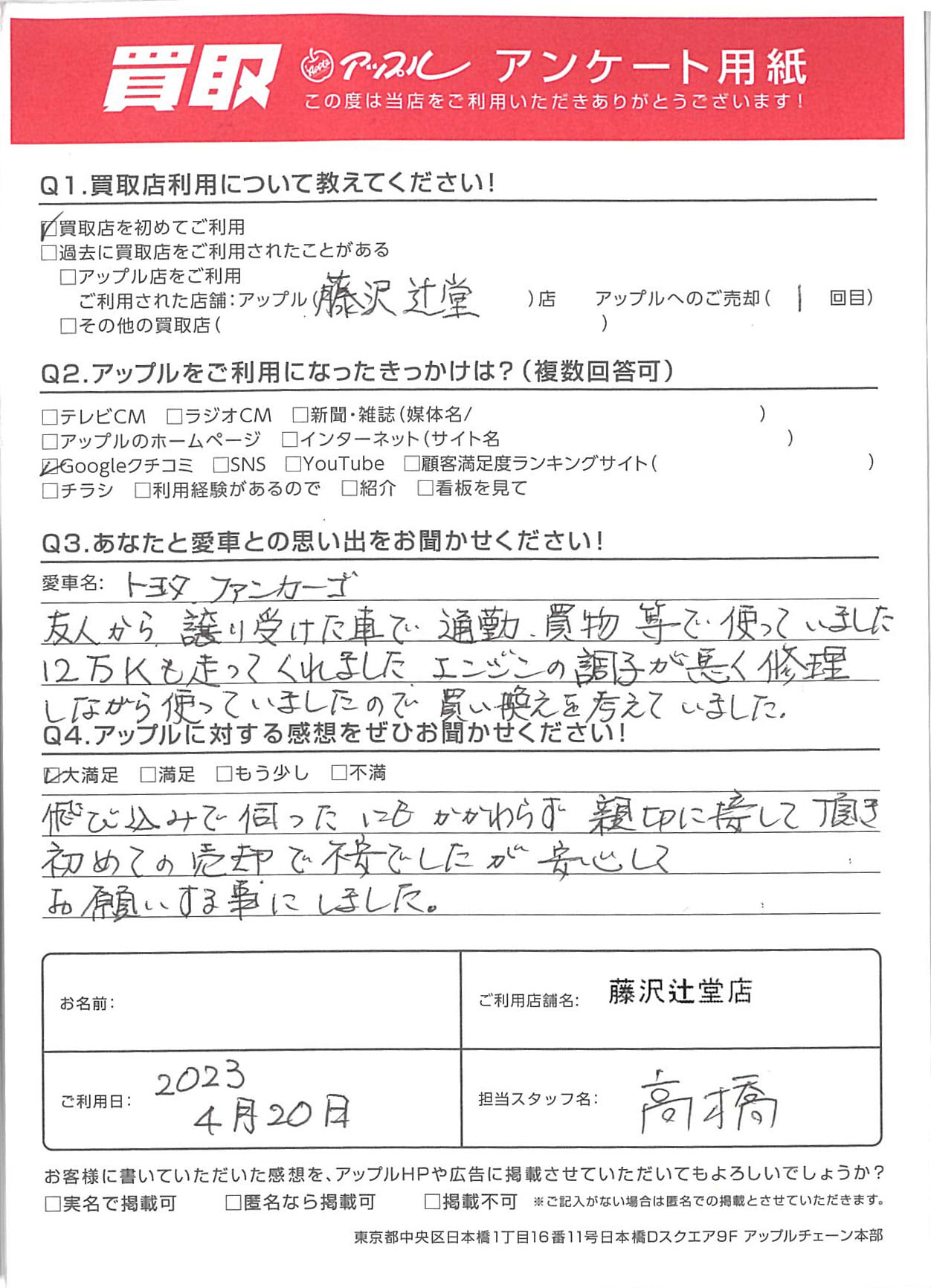 T様 車名:トヨタ ファンカーゴ