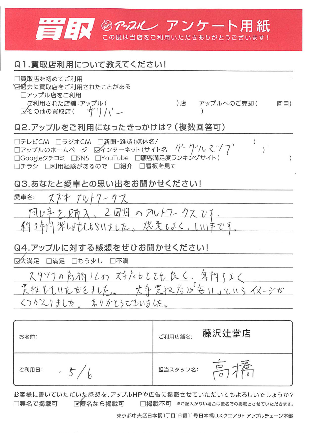 A.スタッフの高橋さんの対応もとても良く、気持ちよく