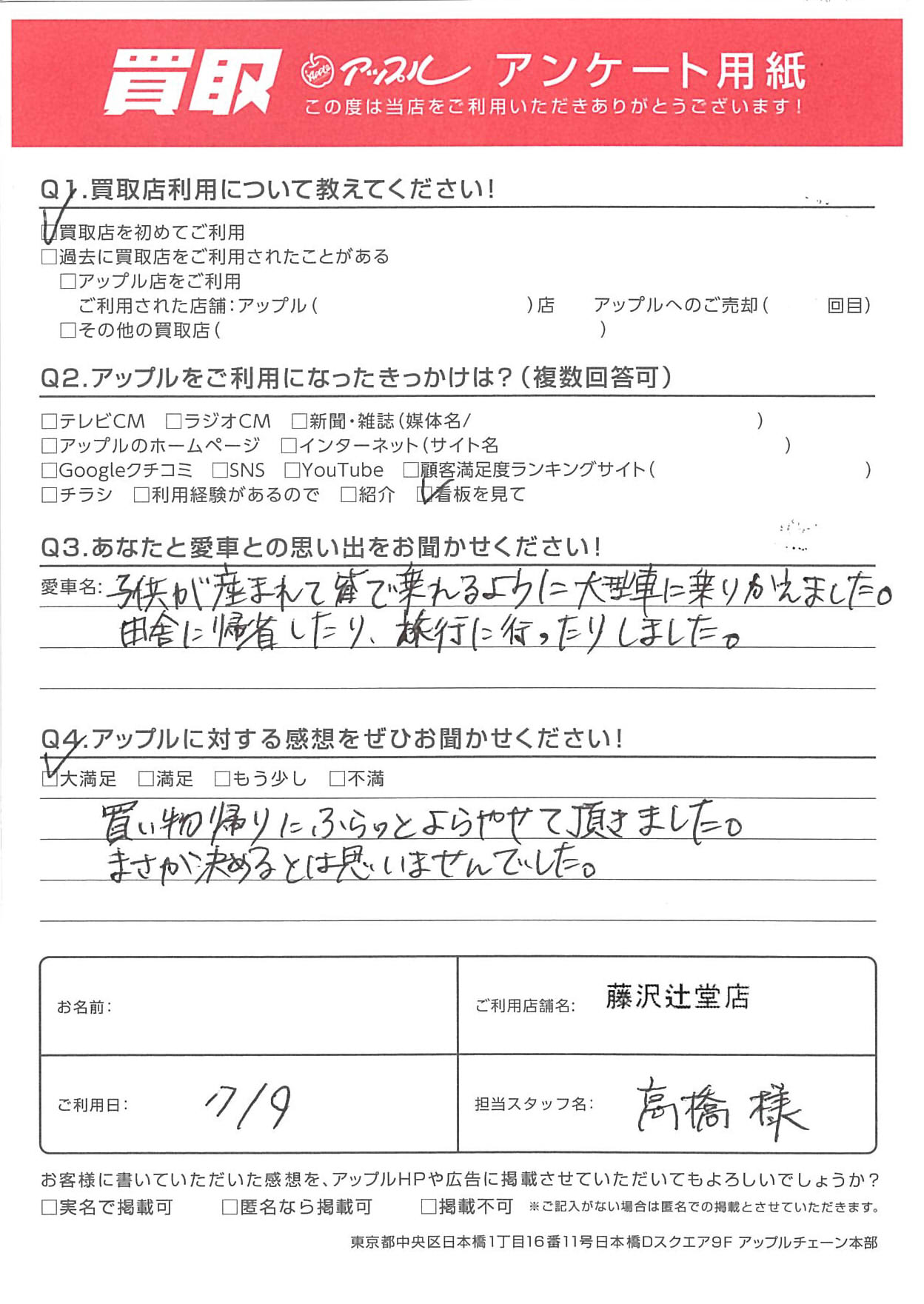お車のご相談・ 査定だけでもOK! カンタン 入力 30秒 アップルがブランド買取始めました! お電話でも受付中! 受付時間10:00 ~ 18:30 0120-974-899 お車のご相談・ 査定だけでもOK! カンタン 入力 30秒 アップルがブランド買取始めました! お電話でも受付中! 受付時間10:00 ~ 18:30 0120-974-899 アップルがブランド買取始めました! お電話でも受付中! 受付時間10:00 ~ 18:30 0120-974-899 店舗情報 在庫車 スタッフ紹介 ブログ お客様の声 キャンペーン お得 無料査定 click お客様の声 ご記入日: 2023/07/09 S様 Q.あなたと愛車との思い出をお聞かせください!A.子供が産まれて皆で乗れるように大型車に乗りかえました。 田舎に帰省したり、旅行に行ったりしました。Q.アップルに対する感想をぜひお聞かせください!A.買い物帰りにふらっとよらせて頂きました。 まさか決めるとは思いませんでした。担当:高橋 前へ 次へ お客様の声一覧を見る