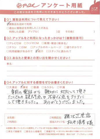 お車のご相談・ 査定だけでもOK! カンタン 入力 30秒 アップルがブランド買取始めました! お電話でも受付中! 受付時間10:00 ~ 18:30 0120-974-899 お車のご相談・ 査定だけでもOK! カンタン 入力 30秒 アップルがブランド買取始めました! お電話でも受付中! 受付時間10:00 ~ 18:30 0120-974-899 アップルがブランド買取始めました! お電話でも受付中! 受付時間10:00 ~ 18:30 0120-974-899 店舗情報 在庫車 スタッフ紹介 ブログ お客様の声 キャンペーン お得 無料査定 click お客様の声 ご記入日: 2015/03/17 S様 Q.アップルの感想は? A.事前の電話から親切に対応して頂き たくさんの疑問点や不安な点をクリアにして頂きました。ありがとうございました。 前へ 次へ お客様の声一覧を見る
