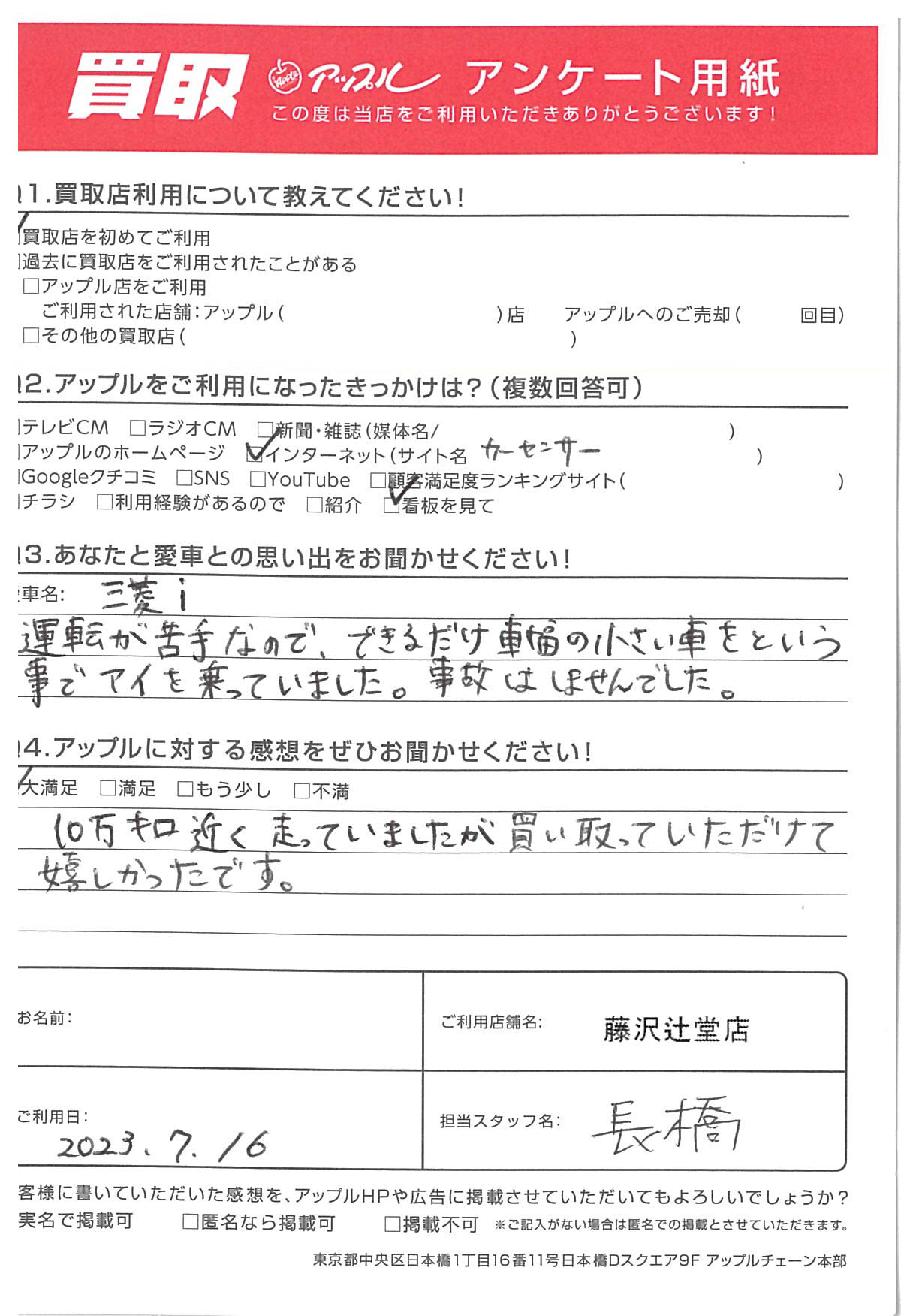 お車のご相談・ 査定だけでもOK! カンタン 入力 30秒 アップルがブランド買取始めました! お電話でも受付中! 受付時間10:00 ~ 18:30 0120-974-899 お車のご相談・ 査定だけでもOK! カンタン 入力 30秒 アップルがブランド買取始めました! お電話でも受付中! 受付時間10:00 ~ 18:30 0120-974-899 アップルがブランド買取始めました! お電話でも受付中! 受付時間10:00 ~ 18:30 0120-974-899 店舗情報 在庫車 スタッフ紹介 ブログ お客様の声 キャンペーン お得 無料査定 click お客様の声 ご記入日: 2023/07/16 I様 車名:三菱 eKスペース Q.あなたと愛車との思い出をお聞かせください!A.運転が苦手なので、できるだけ車幅の小さい車を という事でアイを乗っていました。 事故はしませんでした。Q.アップルに対する感想をぜひお聞かせください!A.10万キロ近く走っていましたが買い取っていただけて 嬉しかったです。担当:長橋 前へ 次へ お客様の声一覧を見る