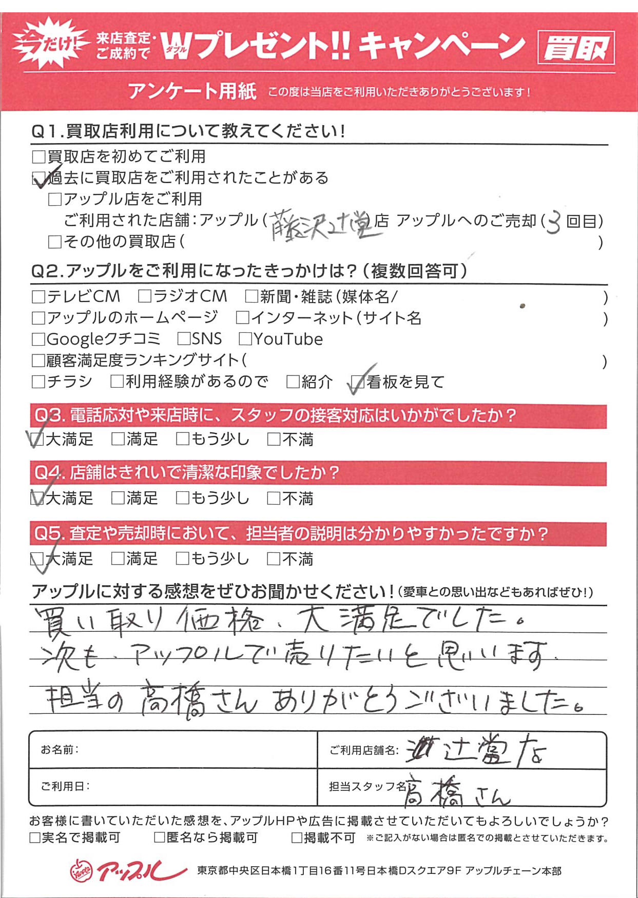 お車のご相談・ 査定だけでもOK! カンタン 入力 30秒 アップルがブランド買取始めました! お電話でも受付中! 受付時間10:00 ~ 18:30 0120-974-899 お車のご相談・ 査定だけでもOK! カンタン 入力 30秒 アップルがブランド買取始めました! お電話でも受付中! 受付時間10:00 ~ 18:30 0120-974-899 アップルがブランド買取始めました! お電話でも受付中! 受付時間10:00 ~ 18:30 0120-974-899 店舗情報 在庫車 スタッフ紹介 ブログ お客様の声 キャンペーン お得 無料査定 click お客様の声 ご記入日: 2023/09/21 S様 Q.アップルに対する感想をぜひお聞かせください!A.買取価格、大満足でした。 次もアップルで売りたいと思います。 担当の高橋さんありがとうございました。担当:高橋 前へ 次へ お客様の声一覧を見る