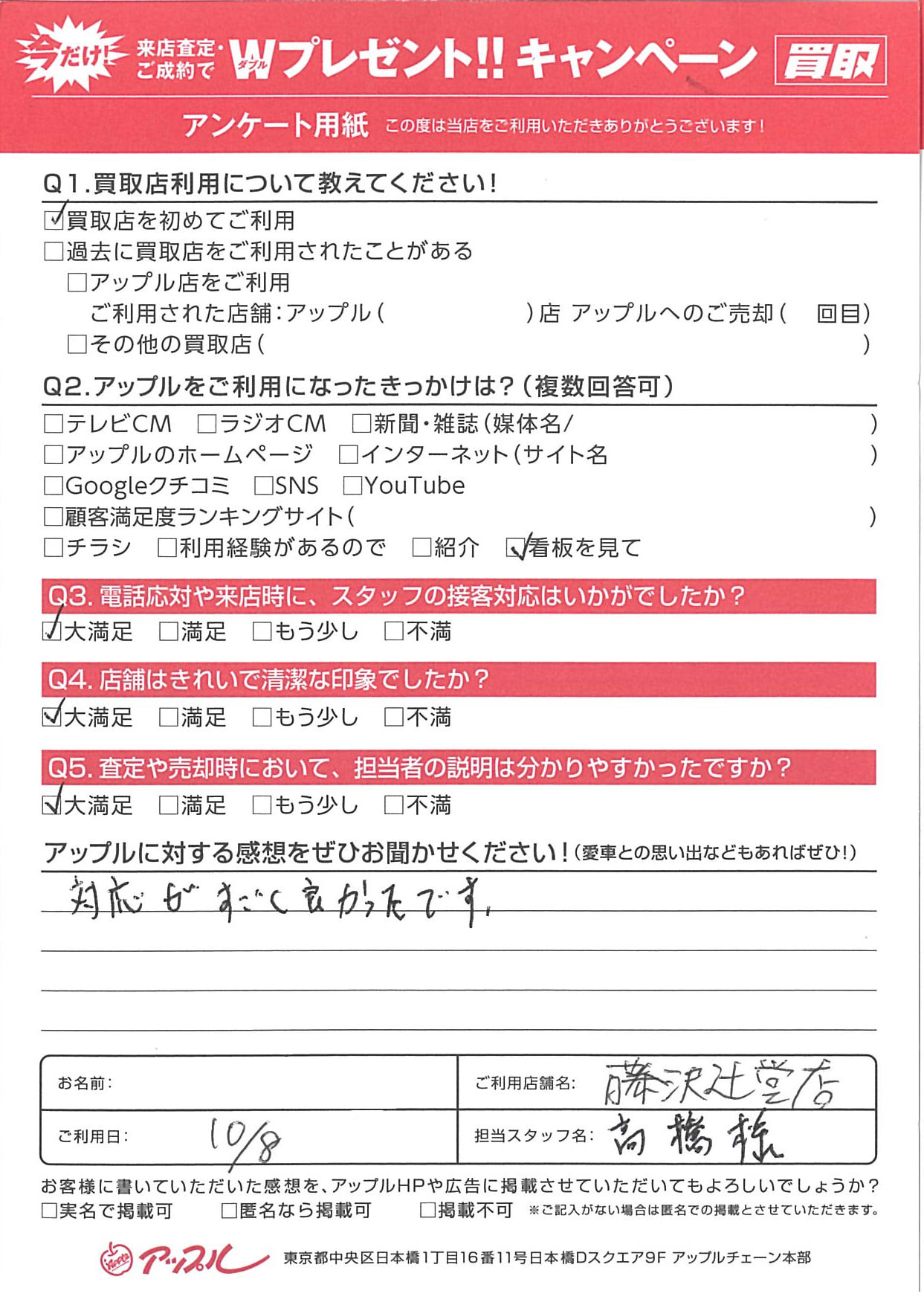 お車のご相談・ 査定だけでもOK! カンタン 入力 30秒 アップルがブランド買取始めました! お電話でも受付中! 受付時間10:00 ~ 18:30 0120-974-899 お車のご相談・ 査定だけでもOK! カンタン 入力 30秒 アップルがブランド買取始めました! お電話でも受付中! 受付時間10:00 ~ 18:30 0120-974-899 アップルがブランド買取始めました! お電話でも受付中! 受付時間10:00 ~ 18:30 0120-974-899 店舗情報 在庫車 スタッフ紹介 ブログ お客様の声 キャンペーン お得 無料査定 click お客様の声 ご記入日: 2023/10/08 S様 Q.アップルに対する感想をぜひお聞かせください!A.対応がすごく良かったです。担当:高橋 前へ 次へ お客様の声一覧を見る