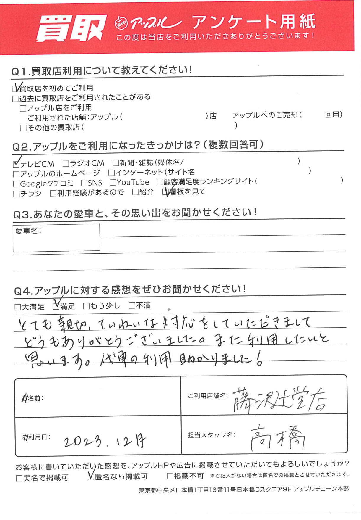 お車のご相談・ 査定だけでもOK! カンタン 入力 30秒 アップルがブランド買取始めました! お電話でも受付中! 受付時間10:00 ~ 18:30 0120-974-899 お車のご相談・ 査定だけでもOK! カンタン 入力 30秒 アップルがブランド買取始めました! お電話でも受付中! 受付時間10:00 ~ 18:30 0120-974-899 アップルがブランド買取始めました! お電話でも受付中! 受付時間10:00 ~ 18:30 0120-974-899 店舗情報 在庫車 スタッフ紹介 ブログ お客様の声 キャンペーン お得 無料査定 click お客様の声 ご記入日: 2023/12/30 匿名希望様 Q.アップルに対する感想をぜひお聞かせください! とても親切、ていねいな対応をしていただきまして どうもありがとうございました。 また利用したいと思います。代車の利用助かりました!担当 高橋 前へ 次へ お客様の声一覧を見る