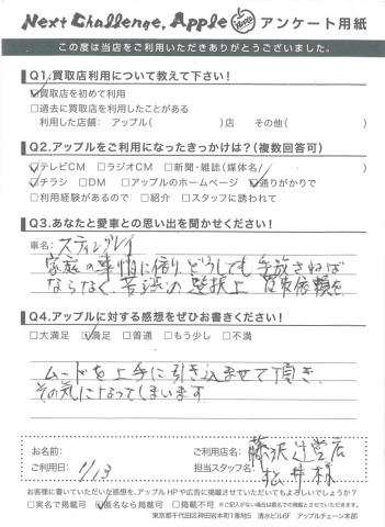 お車のご相談・ 査定だけでもOK! カンタン 入力 30秒 アップルがブランド買取始めました! お電話でも受付中! 受付時間10:00 ~ 18:30 0120-974-899 お車のご相談・ 査定だけでもOK! カンタン 入力 30秒 アップルがブランド買取始めました! お電話でも受付中! 受付時間10:00 ~ 18:30 0120-974-899 アップルがブランド買取始めました! お電話でも受付中! 受付時間10:00 ~ 18:30 0120-974-899 店舗情報 在庫車 スタッフ紹介 ブログ お客様の声 キャンペーン お得 無料査定 click お客様の声 ご記入日: 2015/05/11 K様 お車:スティングレイQ.愛車との思い出は?A.家庭の事情に依りどうても手放さねばならなく、苦渋の選択上買取依頼を。Q.アップルの感想は?A.ムードを上手に引き込ませて頂き、その気になってしまいます。 前へ 次へ お客様の声一覧を見る