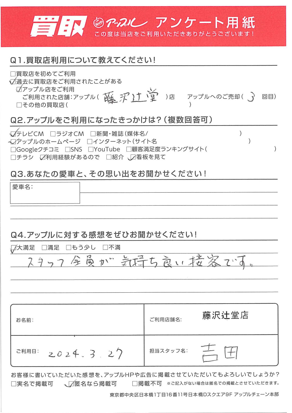 お車のご相談・ 査定だけでもOK! カンタン 入力 30秒 アップルがブランド買取始めました! お電話でも受付中! 受付時間10:00 ~ 18:30 0120-974-899 お車のご相談・ 査定だけでもOK! カンタン 入力 30秒 アップルがブランド買取始めました! お電話でも受付中! 受付時間10:00 ~ 18:30 0120-974-899 アップルがブランド買取始めました! お電話でも受付中! 受付時間10:00 ~ 18:30 0120-974-899 店舗情報 在庫車 スタッフ紹介 ブログ お客様の声 キャンペーン お得 無料査定 click お客様の声 ご記入日: 2024/03/27 匿名希望様 Q.アップルに対する感想をぜひお聞かせください!A.スタッフ全員が気持ち良い接客です。担当:吉田 前へ 次へ お客様の声一覧を見る