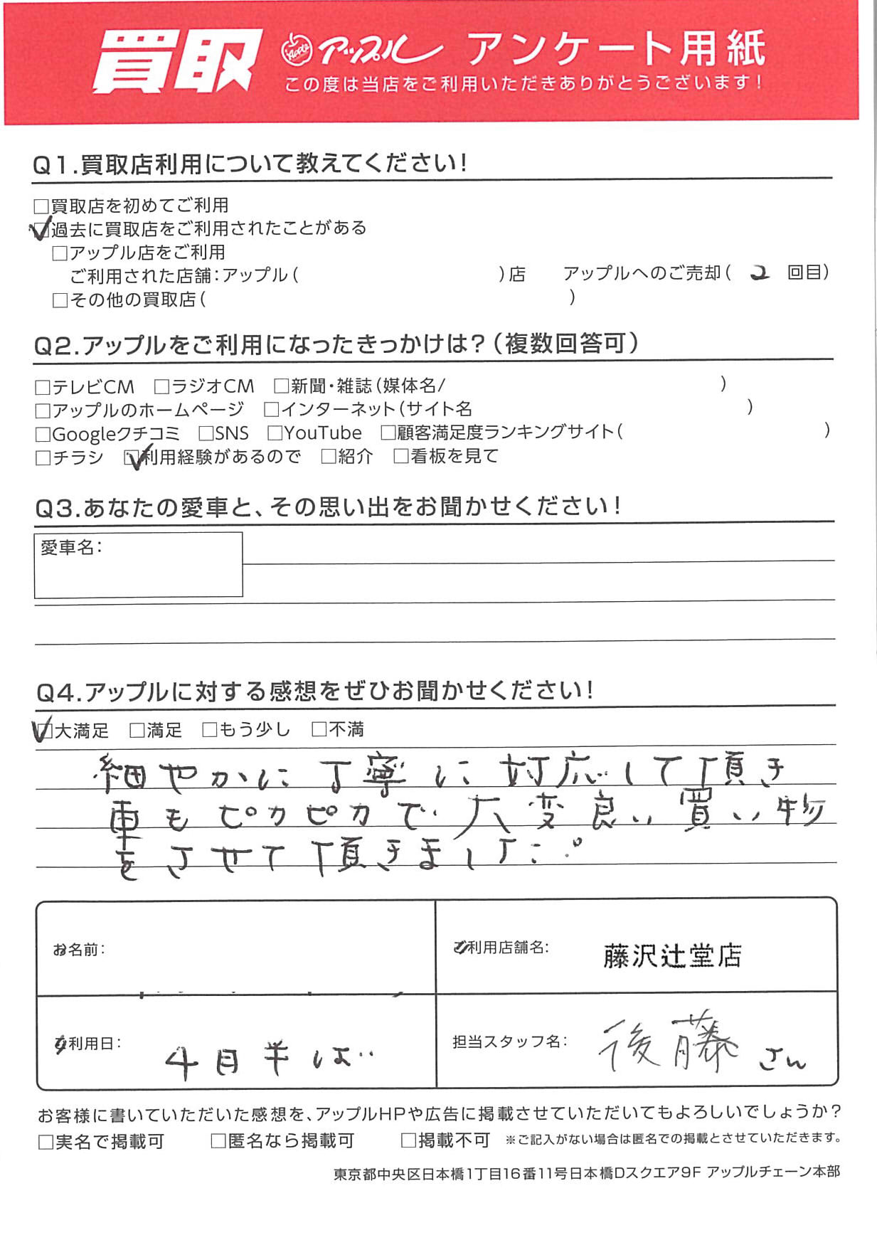 お車のご相談・ 査定だけでもOK! カンタン 入力 30秒 アップルがブランド買取始めました! お電話でも受付中! 受付時間10:00 ~ 18:30 0120-974-899 お車のご相談・ 査定だけでもOK! カンタン 入力 30秒 アップルがブランド買取始めました! お電話でも受付中! 受付時間10:00 ~ 18:30 0120-974-899 アップルがブランド買取始めました! お電話でも受付中! 受付時間10:00 ~ 18:30 0120-974-899 店舗情報 在庫車 スタッフ紹介 ブログ お客様の声 キャンペーン お得 無料査定 click お客様の声 ご記入日: 2024/04/15 I様 Q.アップルに対する感想をぜひお聞かせください!A.細やかに丁寧に対応して頂き車もピカピカで大変良い 買い物をさせて頂きました。担当:後藤 前へ 次へ お客様の声一覧を見る