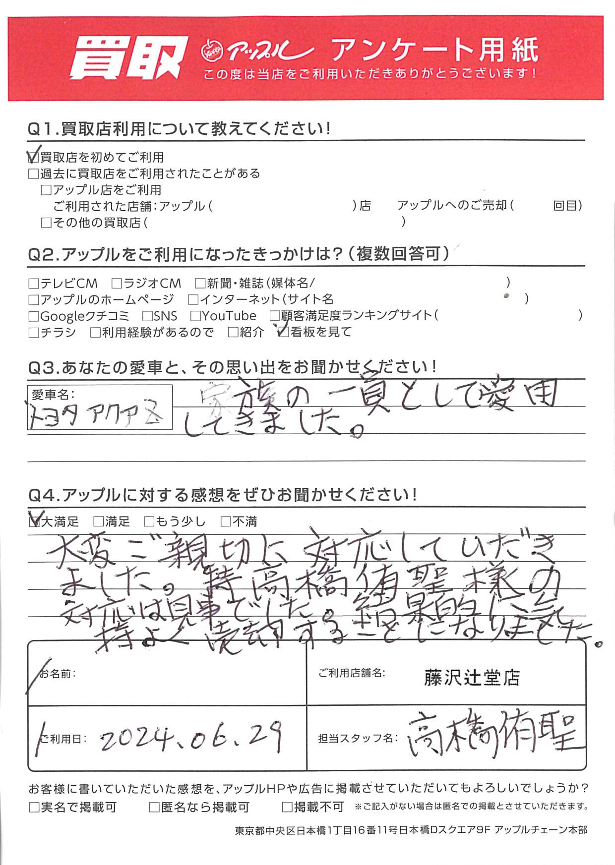 お車のご相談・ 査定だけでもOK! カンタン 入力 30秒 アップルがブランド買取始めました! お電話でも受付中! 受付時間10:00 ~ 18:30 0120-974-899 お車のご相談・ 査定だけでもOK! カンタン 入力 30秒 アップルがブランド買取始めました! お電話でも受付中! 受付時間10:00 ~ 18:30 0120-974-899 アップルがブランド買取始めました! お電話でも受付中! 受付時間10:00 ~ 18:30 0120-974-899 店舗情報 在庫車 スタッフ紹介 ブログ お客様の声 キャンペーン お得 無料査定 click お客様の声 ご記入日: 2024/06/29 T様 車名:トヨタ アクア Q.あなたと愛車との思い出をお聞かせください!A.家族の一員として愛用してきました。Q.アップルに対する感想をぜひお聞かせください!A.大変ご親切に対応していただきました。 特に高橋侑聖様の対応は見事でした。結果的に 気持ちよく売却することになりました。担当:高橋 前へ 次へ お客様の声一覧を見る