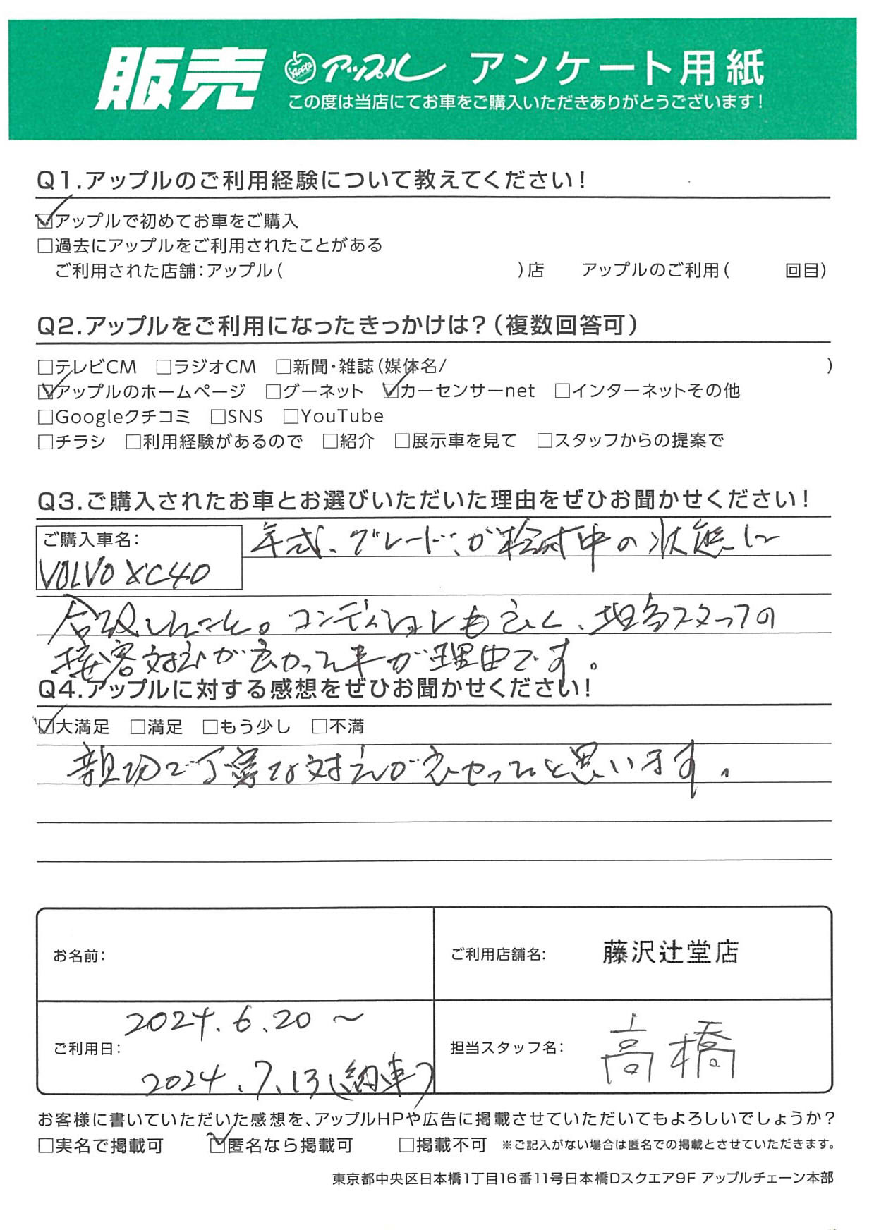 お車のご相談・ 査定だけでもOK! カンタン 入力 30秒 アップルがブランド買取始めました! お電話でも受付中! 受付時間10:00 ~ 18:30 0120-974-899 お車のご相談・ 査定だけでもOK! カンタン 入力 30秒 アップルがブランド買取始めました! お電話でも受付中! 受付時間10:00 ~ 18:30 0120-974-899 アップルがブランド買取始めました! お電話でも受付中! 受付時間10:00 ~ 18:30 0120-974-899 店舗情報 在庫車 スタッフ紹介 ブログ お客様の声 キャンペーン お得 無料査定 click お客様の声 ご記入日: 2024/07/13 匿名希望様 車名:ボルボ XC40 Q.お選びいただいた理由をお聞かせください!A.年式、グレードが検討中の状態に合致したこと。 コンディションも良く、担当スタッフの接客対応が 良かった事が理由です。Q.アップルに対する感想をぜひお聞かせください!A.親切で丁寧な対応が良かったと思います。担当:高橋 前へ 次へ お客様の声一覧を見る