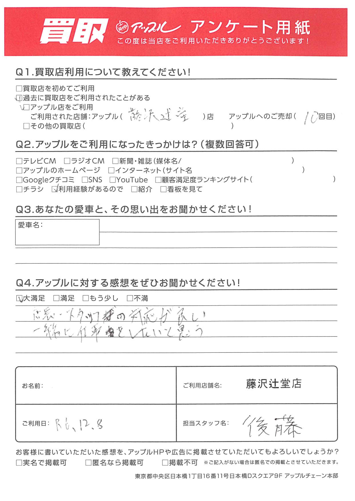 お車のご相談・ 査定だけでもOK! カンタン 入力 30秒 アップルがブランド買取始めました! お電話でも受付中! 受付時間10:00 ~ 18:30 0120-974-899 お車のご相談・ 査定だけでもOK! カンタン 入力 30秒 アップルがブランド買取始めました! お電話でも受付中! 受付時間10:00 ~ 18:30 0120-974-899 アップルがブランド買取始めました! お電話でも受付中! 受付時間10:00 ~ 18:30 0120-974-899 店舗情報 在庫車 スタッフ紹介 ブログ お客様の声 キャンペーン お得 無料査定 click お客様の声 ご記入日: 2024/12/08 S様 Q.アップルに対する感想をぜひお聞かせください!A.店長・スタッフの対応が良い 一緒に仕事をしたいと思う担当:後藤 前へ 次へ お客様の声一覧を見る