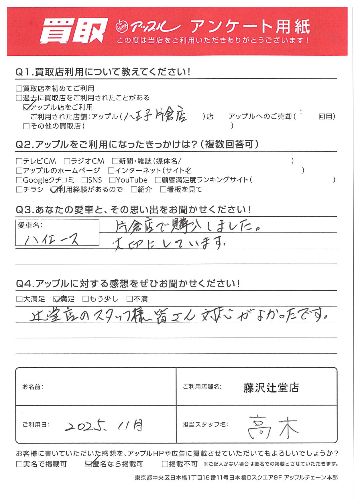 お車のご相談・ 査定だけでもOK! カンタン 入力 30秒 アップルがブランド買取始めました! お電話でも受付中! 受付時間10:00 ~ 18:30 0120-974-899 お車のご相談・ 査定だけでもOK! カンタン 入力 30秒 アップルがブランド買取始めました! お電話でも受付中! 受付時間10:00 ~ 18:30 0120-974-899 アップルがブランド買取始めました! お電話でも受付中! 受付時間10:00 ~ 18:30 0120-974-899 店舗情報 在庫車 スタッフ紹介 ブログ お客様の声 キャンペーン お得 無料査定 click お客様の声 ご記入日: 2025/11/25 匿名希望様 車名:トヨタ Q.愛車との思い出をお聞かせください!A.片倉店で購入しました。大切にしています。Q.アップルに対する感想をぜひお聞かせください!A.辻堂店のスタッフ様皆さん対応がよかったです。担当:高木 前へ 次へ お客様の声一覧を見る