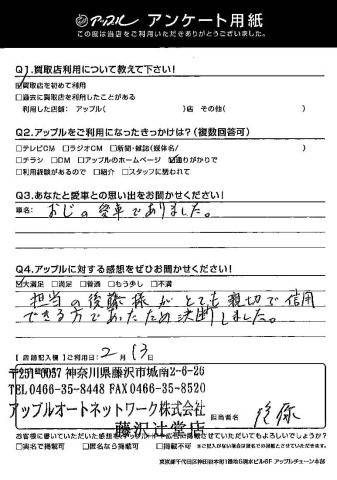 お車のご相談・ 査定だけでもOK! カンタン 入力 30秒 アップルがブランド買取始めました! お電話でも受付中! 受付時間10:00 ~ 18:30 0120-974-899 お車のご相談・ 査定だけでもOK! カンタン 入力 30秒 アップルがブランド買取始めました! お電話でも受付中! 受付時間10:00 ~ 18:30 0120-974-899 アップルがブランド買取始めました! お電話でも受付中! 受付時間10:00 ~ 18:30 0120-974-899 店舗情報 在庫車 スタッフ紹介 ブログ お客様の声 キャンペーン お得 無料査定 click お客様の声 ご記入日: 2016/11/24 O様 愛車との思い出は?おじの愛車でありました。アップルの感想は?担当の後藤様がとても親切で信用できる方であったため決断しました。 前へ 次へ お客様の声一覧を見る