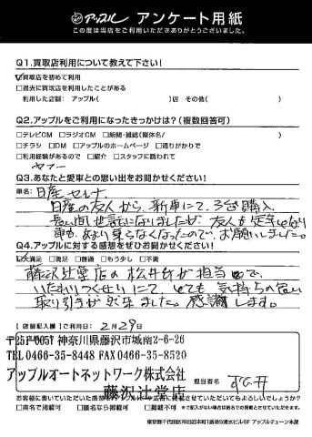 お車のご相談・ 査定だけでもOK! カンタン 入力 30秒 アップルがブランド買取始めました! お電話でも受付中! 受付時間10:00 ~ 18:30 0120-974-899 お車のご相談・ 査定だけでもOK! カンタン 入力 30秒 アップルがブランド買取始めました! お電話でも受付中! 受付時間10:00 ~ 18:30 0120-974-899 アップルがブランド買取始めました! お電話でも受付中! 受付時間10:00 ~ 18:30 0120-974-899 店舗情報 在庫車 スタッフ紹介 ブログ お客様の声 キャンペーン お得 無料査定 click お客様の声 ご記入日: 2016/09/23 S様 愛車との思い出は?日産の友人から新車にて3台購入。長い間世話になりましたが、友人も定年となり車もあまり乗らなくなったのでお願いしました。アップルの感想は?藤沢辻堂店の松井氏が担当でいたれりつくせりにてとても気持ちの良い取り引きが出来ました。感謝します。 前へ 次へ お客様の声一覧を見る