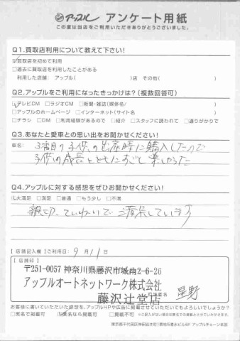 お車のご相談・ 査定だけでもOK! カンタン 入力 30秒 アップルがブランド買取始めました! お電話でも受付中! 受付時間10:00 ~ 18:30 0120-974-899 お車のご相談・ 査定だけでもOK! カンタン 入力 30秒 アップルがブランド買取始めました! お電話でも受付中! 受付時間10:00 ~ 18:30 0120-974-899 アップルがブランド買取始めました! お電話でも受付中! 受付時間10:00 ~ 18:30 0120-974-899 店舗情報 在庫車 スタッフ紹介 ブログ お客様の声 キャンペーン お得 無料査定 click お客様の声 ご記入日: 2017/06/03 匿名希望様 お車:ビアンテQ.愛車との思い出は?A.3番目の子供の出産時に購入したので、子供の成長とともにすごし楽しかったQ.アップルの感想は?A.新設、ていねいで満足しています 前へ 次へ お客様の声一覧を見る