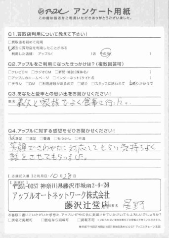 お車のご相談・ 査定だけでもOK! カンタン 入力 30秒 アップルがブランド買取始めました! お電話でも受付中! 受付時間10:00 ~ 18:30 0120-974-899 お車のご相談・ 査定だけでもOK! カンタン 入力 30秒 アップルがブランド買取始めました! お電話でも受付中! 受付時間10:00 ~ 18:30 0120-974-899 アップルがブランド買取始めました! お電話でも受付中! 受付時間10:00 ~ 18:30 0120-974-899 店舗情報 在庫車 スタッフ紹介 ブログ お客様の声 キャンペーン お得 無料査定 click お客様の声 ご記入日: 2017/06/29 W様 Q.愛車との思い出は?A.義父と家族でよく食事に行った。Q.アップルの感想は?A.笑顔でさわやかに対応してもらい気持ちよく話をさせてもらいました。 前へ 次へ お客様の声一覧を見る
