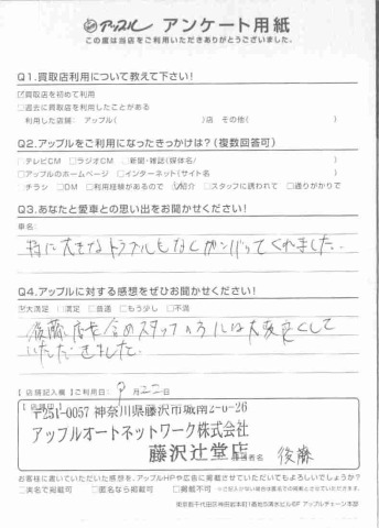 お車のご相談・ 査定だけでもOK! カンタン 入力 30秒 アップルがブランド買取始めました! お電話でも受付中! 受付時間10:00 ~ 18:30 0120-974-899 お車のご相談・ 査定だけでもOK! カンタン 入力 30秒 アップルがブランド買取始めました! お電話でも受付中! 受付時間10:00 ~ 18:30 0120-974-899 アップルがブランド買取始めました! お電話でも受付中! 受付時間10:00 ~ 18:30 0120-974-899 店舗情報 在庫車 スタッフ紹介 ブログ お客様の声 キャンペーン お得 無料査定 click お客様の声 ご記入日: 2017/08/10 N様 お車:ハイエースQ.愛車との思い出は?A.特に大きなトラブルもなくガンバってくれました。Q.アップルの感想は?A.後藤店長含めスタッフの方には大変良くしていただきました。 前へ 次へ お客様の声一覧を見る