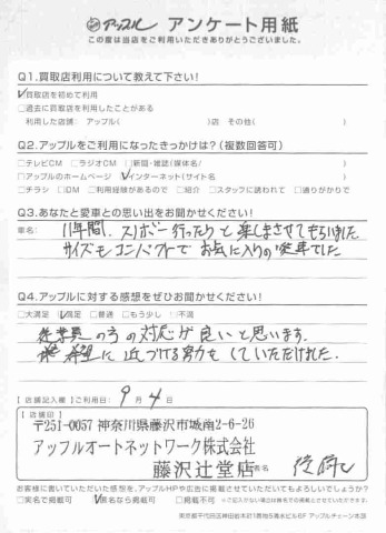 お車のご相談・ 査定だけでもOK! カンタン 入力 30秒 アップルがブランド買取始めました! お電話でも受付中! 受付時間10:00 ~ 18:30 0120-974-899 お車のご相談・ 査定だけでもOK! カンタン 入力 30秒 アップルがブランド買取始めました! お電話でも受付中! 受付時間10:00 ~ 18:30 0120-974-899 アップルがブランド買取始めました! お電話でも受付中! 受付時間10:00 ~ 18:30 0120-974-899 店舗情報 在庫車 スタッフ紹介 ブログ お客様の声 キャンペーン お得 無料査定 click お客様の声 ご記入日: 2017/08/18 匿名希望様 お車:チェロキーQ.愛車との思い出は?A.11年間スノボー行ったりと楽しまさせてもらいました。サイズもコンパクトでお気に入りの愛車でした。Q.アップルの感想は?A.従業員の方の対応が良いと思います。希望に近づける努力をしていただけました。 前へ 次へ お客様の声一覧を見る