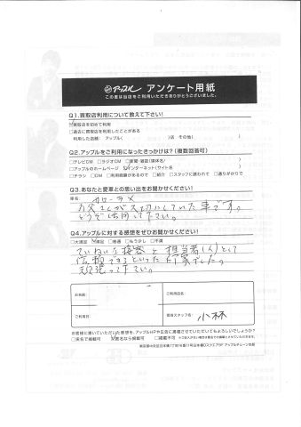 お車のご相談・ 査定だけでもOK! カンタン 入力 30秒 アップルがブランド買取始めました! お電話でも受付中! 受付時間10:00 ~ 18:30 0120-974-899 お車のご相談・ 査定だけでもOK! カンタン 入力 30秒 アップルがブランド買取始めました! お電話でも受付中! 受付時間10:00 ~ 18:30 0120-974-899 アップルがブランド買取始めました! お電話でも受付中! 受付時間10:00 ~ 18:30 0120-974-899 店舗情報 在庫車 スタッフ紹介 ブログ お客様の声 キャンペーン お得 無料査定 click お客様の声 ご記入日: 2017/12/25 T様 Q.あなたと愛車との思い出をお聞かせください!カローラXお父さんが大切にしていた車です。どうぞ活用してください。Q.アップルに対する感想をぜひお書きください!ていねいな接客と担当者(人)として信頼できるといった印象でした。頑張ってください。担当スタッフ:小林 前へ 次へ お客様の声一覧を見る