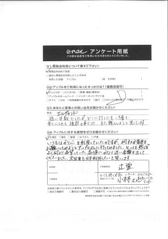 いつもはガリバーを利用していたのですが、何社か査定をお願いしてみようとアップルさんに行ってみました。とっても感じがよく何より希望していた売値にかなり近い金額を出してくださいました。次回も必ず利用したいと思います。