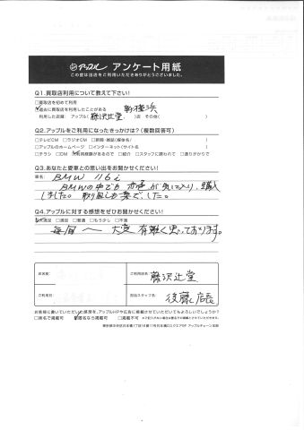 お車のご相談・ 査定だけでもOK! カンタン 入力 30秒 アップルがブランド買取始めました! お電話でも受付中! 受付時間10:00 ~ 18:30 0120-974-899 お車のご相談・ 査定だけでもOK! カンタン 入力 30秒 アップルがブランド買取始めました! お電話でも受付中! 受付時間10:00 ~ 18:30 0120-974-899 アップルがブランド買取始めました! お電話でも受付中! 受付時間10:00 ~ 18:30 0120-974-899 店舗情報 在庫車 スタッフ紹介 ブログ お客様の声 キャンペーン お得 無料査定 click お客様の声 ご記入日: 2018/02/03 I様 Q.あなたと愛車との思い出をお聞かせください!BMW 116iBMWの中でも赤色が気に入り、購入しました。取り回しも楽でした。Q.アップルに対する感想をぜひお書きください!毎回、大変有難く思っております。担当スタッフ:後藤 前へ 次へ お客様の声一覧を見る