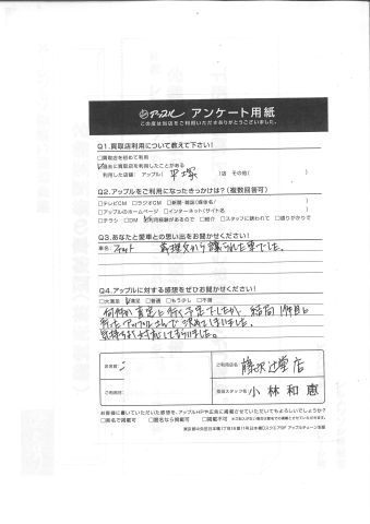 お車のご相談・ 査定だけでもOK! カンタン 入力 30秒 アップルがブランド買取始めました! お電話でも受付中! 受付時間10:00 ~ 18:30 0120-974-899 お車のご相談・ 査定だけでもOK! カンタン 入力 30秒 アップルがブランド買取始めました! お電話でも受付中! 受付時間10:00 ~ 18:30 0120-974-899 アップルがブランド買取始めました! お電話でも受付中! 受付時間10:00 ~ 18:30 0120-974-899 店舗情報 在庫車 スタッフ紹介 ブログ お客様の声 キャンペーン お得 無料査定 click お客様の声 ご記入日: 2018/05/15 A様 Q.あなたと愛車との思い出をお聞かせください!フィット義理父から譲られた車でした。Q.アップルに対する感想をぜひお書きください!何件か査定に行く予定でしたが、結局1件目に行ったアップルさんで決めてしまいました。気持よく対応してもらいました。担当スタッフ:小林 前へ 次へ お客様の声一覧を見る