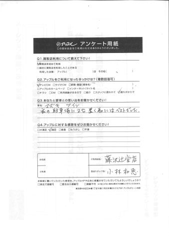 お車のご相談・ 査定だけでもOK! カンタン 入力 30秒 アップルがブランド買取始めました! お電話でも受付中! 受付時間10:00 ~ 18:30 0120-974-899 お車のご相談・ 査定だけでもOK! カンタン 入力 30秒 アップルがブランド買取始めました! お電話でも受付中! 受付時間10:00 ~ 18:30 0120-974-899 アップルがブランド買取始めました! お電話でも受付中! 受付時間10:00 ~ 18:30 0120-974-899 店舗情報 在庫車 スタッフ紹介 ブログ お客様の声 キャンペーン お得 無料査定 click お客様の声 ご記入日: 2018/06/19 Y様 Q.あなたと愛車との思い出をお聞かせください!スズキ・ツイン家の駐車場に2台置く為にはベストでした。担当スタッフ:小林 前へ 次へ お客様の声一覧を見る