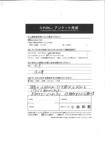 お車のご相談・ 査定だけでもOK! カンタン 入力 30秒 アップルがブランド買取始めました! お電話でも受付中! 受付時間10:00 ~ 18:30 0120-974-899 お車のご相談・ 査定だけでもOK! カンタン 入力 30秒 アップルがブランド買取始めました! お電話でも受付中! 受付時間10:00 ~ 18:30 0120-974-899 アップルがブランド買取始めました! お電話でも受付中! 受付時間10:00 ~ 18:30 0120-974-899 店舗情報 在庫車 スタッフ紹介 ブログ お客様の声 キャンペーン お得 無料査定 click お客様の声 ご記入日: 2018/07/24 T様 Q.あなたと愛車との思い出をお聞かせください!マーチ父の車Q.アップルに対する感想をぜひお書きください!担当の小林さんが、とても親切な対応をして下さり助かりました。ありがとうございました。また機会があればお願いします。担当スタッフ:小林 前へ 次へ お客様の声一覧を見る