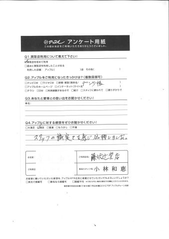 お車のご相談・ 査定だけでもOK! カンタン 入力 30秒 アップルがブランド買取始めました! お電話でも受付中! 受付時間10:00 ~ 18:30 0120-974-899 お車のご相談・ 査定だけでもOK! カンタン 入力 30秒 アップルがブランド買取始めました! お電話でも受付中! 受付時間10:00 ~ 18:30 0120-974-899 アップルがブランド買取始めました! お電話でも受付中! 受付時間10:00 ~ 18:30 0120-974-899 店舗情報 在庫車 スタッフ紹介 ブログ お客様の声 キャンペーン お得 無料査定 click お客様の声 ご記入日: 2018/08/30 A様 Q.アップルに対する感想をぜひお書きください!スタッフの誠実さを感じ依頼しました。担当スタッフ:小林 前へ 次へ お客様の声一覧を見る