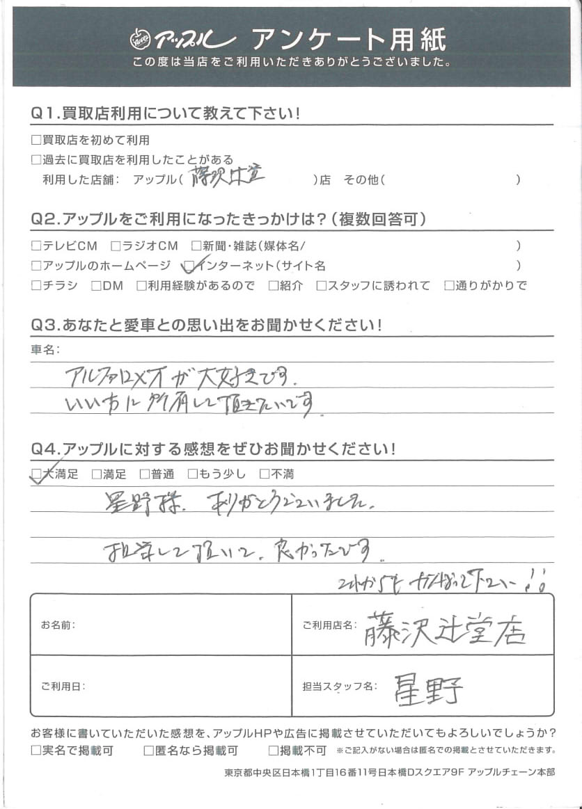 お車のご相談・ 査定だけでもOK! カンタン 入力 30秒 アップルがブランド買取始めました! お電話でも受付中! 受付時間10:00 ~ 18:30 0120-974-899 お車のご相談・ 査定だけでもOK! カンタン 入力 30秒 アップルがブランド買取始めました! お電話でも受付中! 受付時間10:00 ~ 18:30 0120-974-899 アップルがブランド買取始めました! お電話でも受付中! 受付時間10:00 ~ 18:30 0120-974-899 店舗情報 在庫車 スタッフ紹介 ブログ お客様の声 キャンペーン お得 無料査定 click お客様の声 ご記入日: 2019/08/05 匿名希望様 Q.あなたと愛車との思い出をお聞かせください!A.アルファロメオが大好きです。いい方に所有して頂きたいです。Q.アップルに対する感想をぜひお聞かせください!A.星野様、ありがとうございました。担当して頂いて良かったです。 これからもがんばってください!!担当:星野 前へ 次へ お客様の声一覧を見る